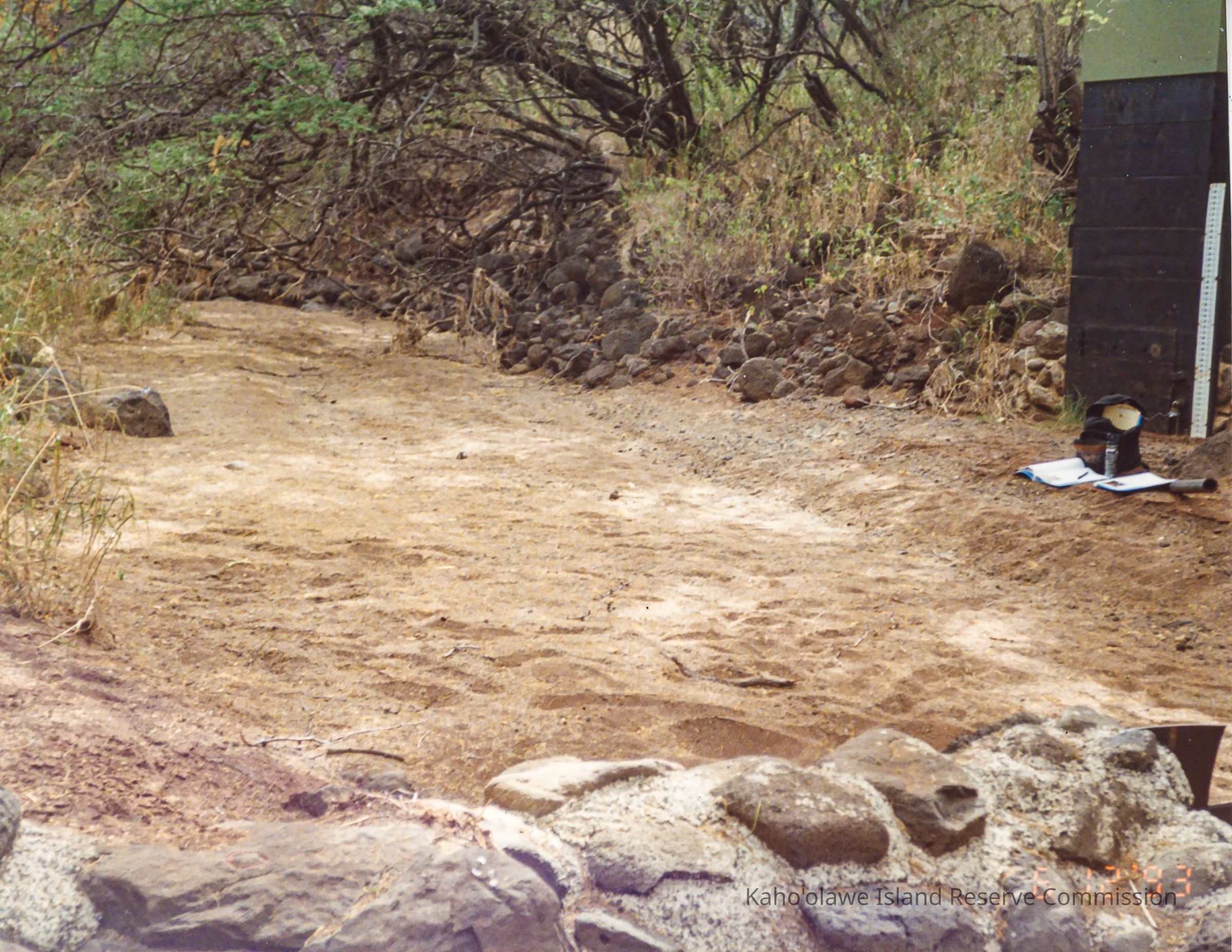 The image captures a dry, sandy path lined with rocks and sparse vegetation with a small structure and scattered objects visible on the right.