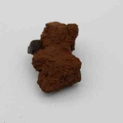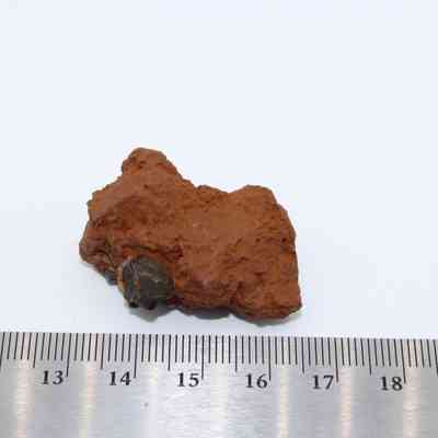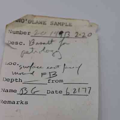 The image shows a basalt piece next to a sample slip with handwritten notes, accompanied by a ruler below.