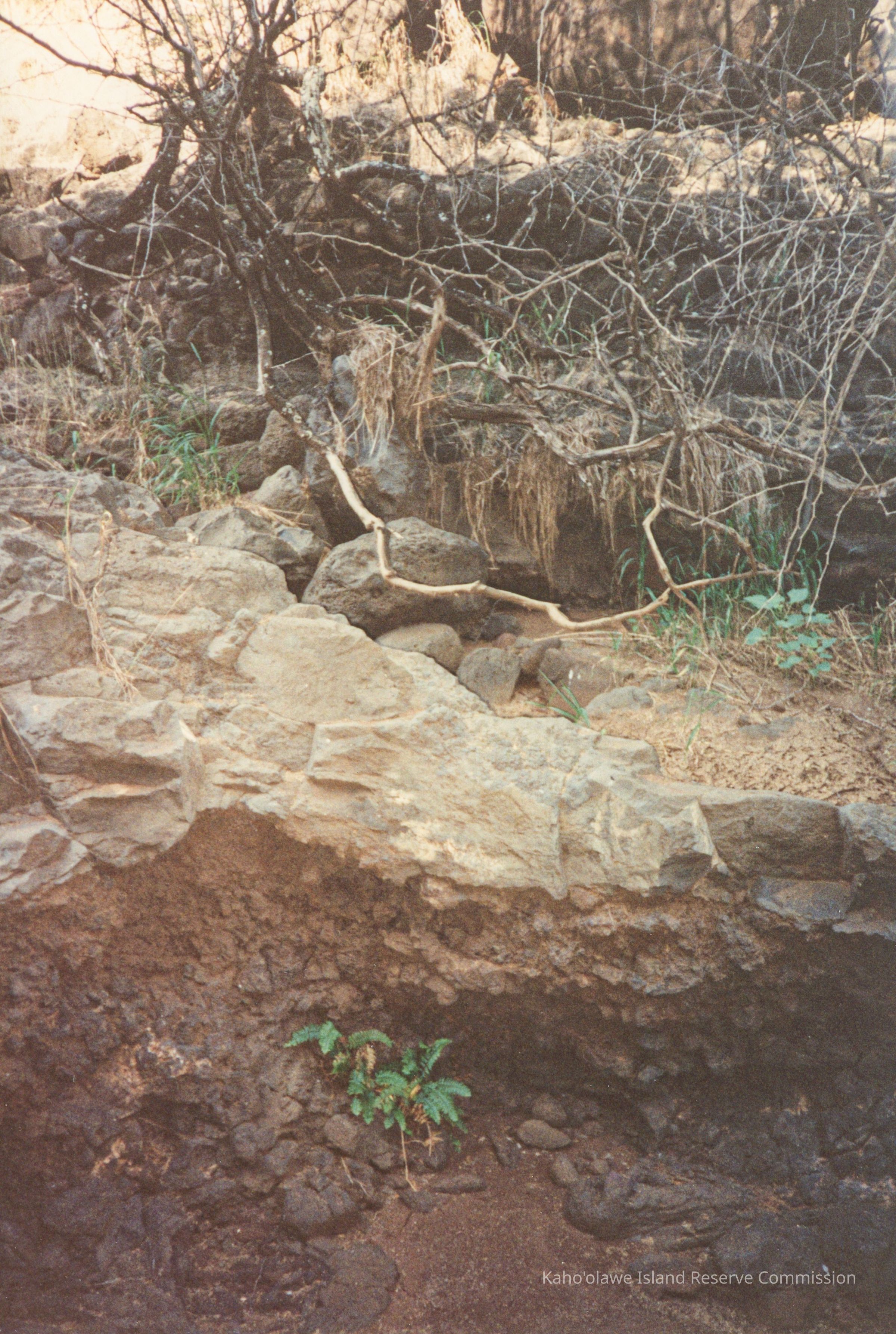 The image shows a rocky, arid landscape with dry branches and sparse vegetation, featuring scattered green plants amidst the rugged terrain.