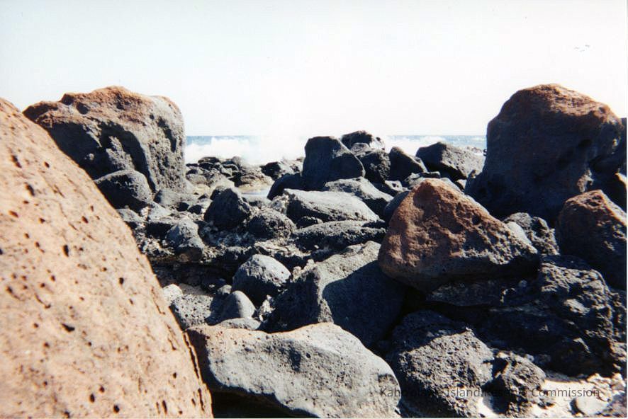Color photo of unidentified rocky shore with wave in background. According to typed label on original album page, photo was taken during the KIRC staff's visit to Kaho'olawe.