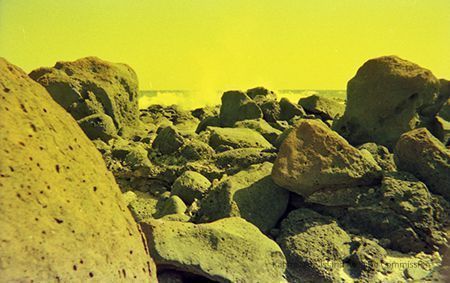 Negative image of unidentified rocky shore with wave in background. Photo may have been taken during KIRC staff's visit to Kaho'olawe according to typed label in original album.