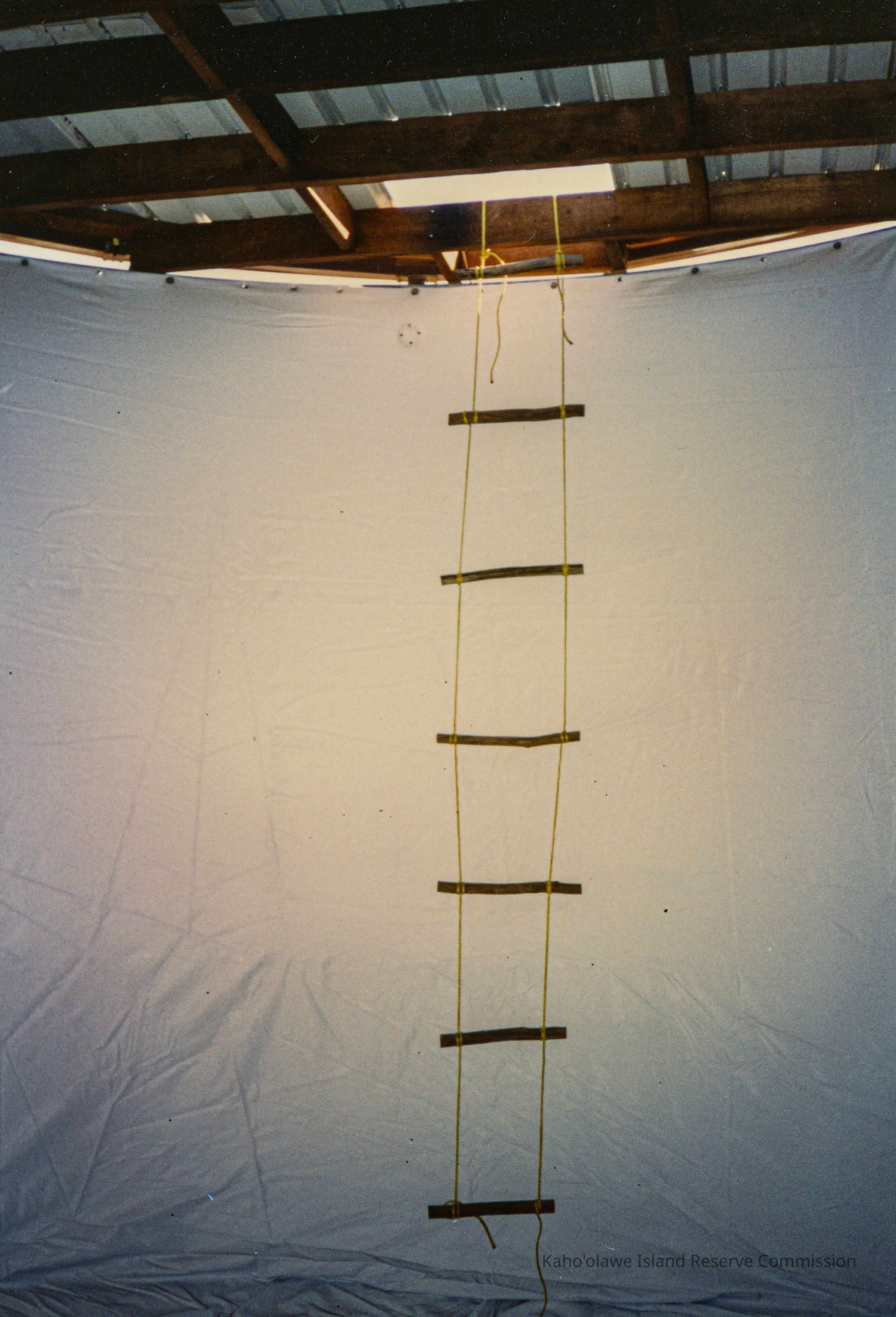 Color photograph of a rope and wood ladder hanging down from the roof into the interior of a water tank.