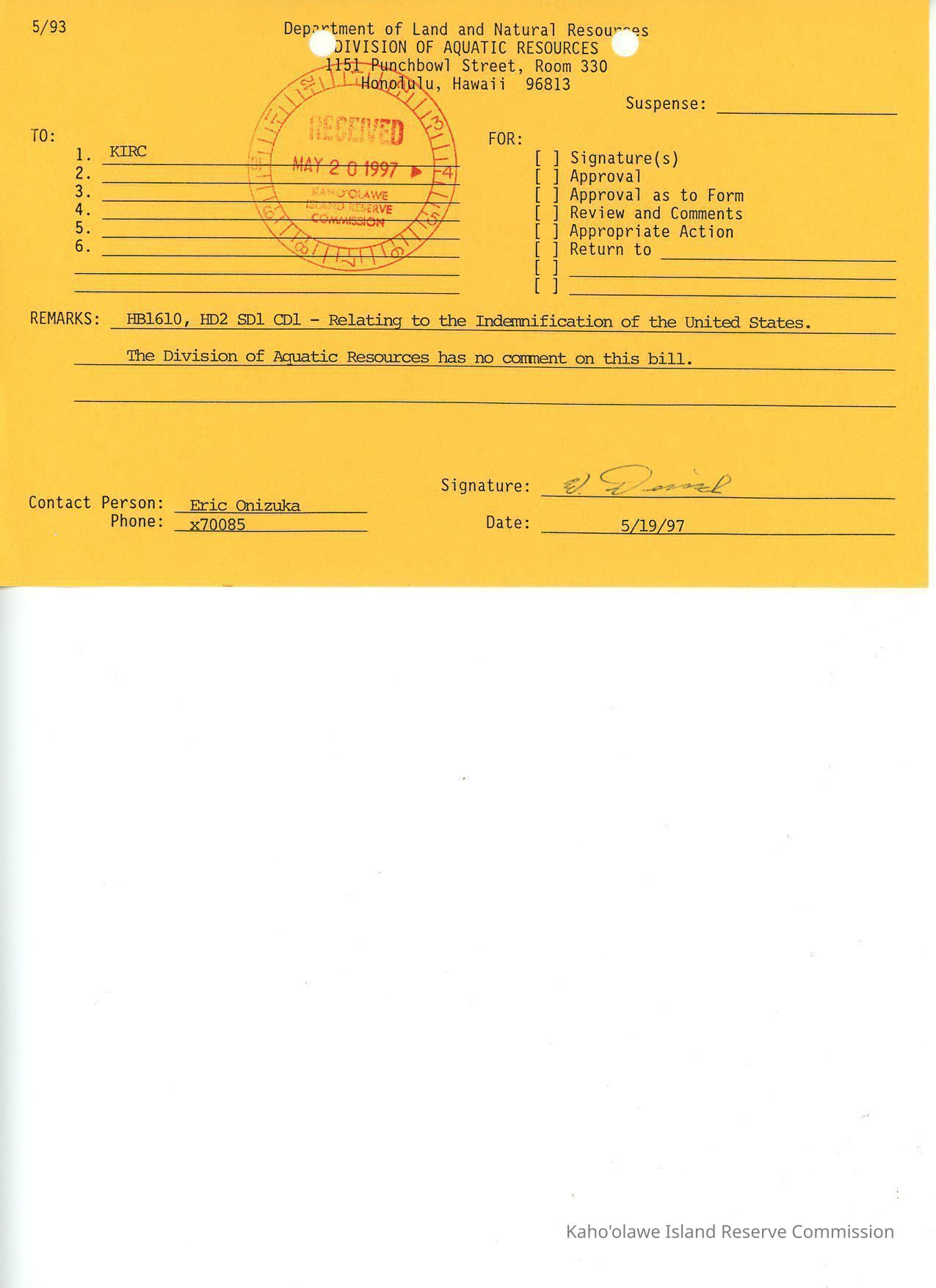 Routing Slip from Department of Land and Natural Resources, Division of Aquatic Resources with remarks about HB1610, HD2 SD1 CD1-Relating to the Indemnification of the United States.Creator