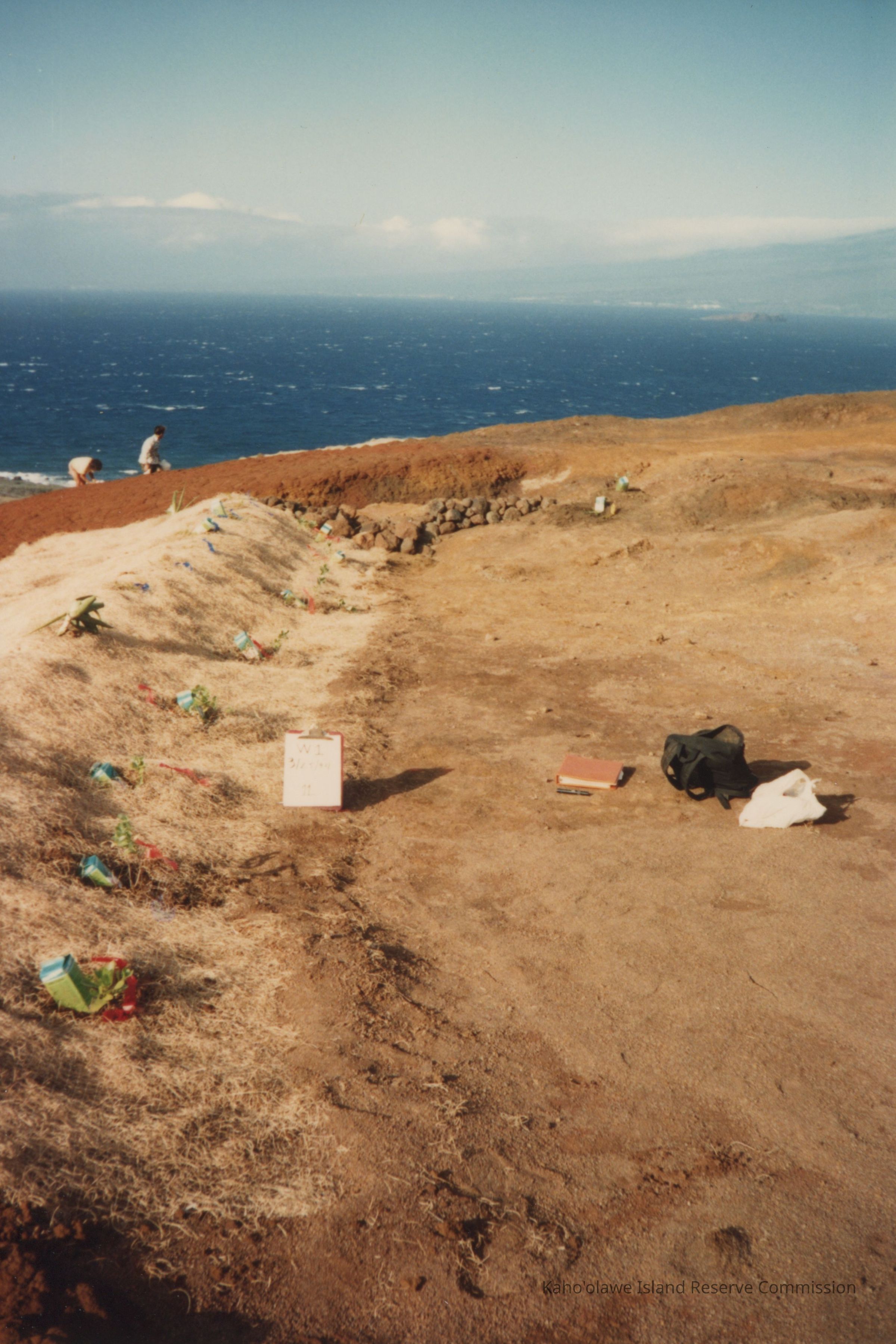 Color photograph of a row of plantings with DriWater, a time release water gel growing through fiber matting on hardpan terrain. A clipboard, backpack and notebooks are to the right of the row. The are two people planting in the far distance with the ocean in the background. Handwritten text on previous page in the original photo album states: "March 1994 3 Day Regular Access. Tank Cover Flew Off!"Photograph Details