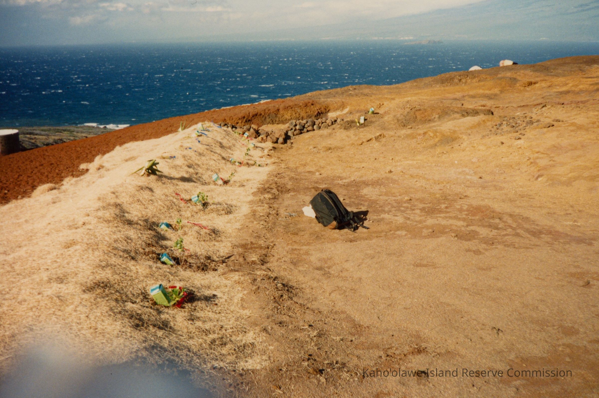 Color photograph of a black backpack sitting on hardpan next to a row of seedlings attached to boxes of DriWater, a time release water gel. The field overlooks the ocean. Handwritten text above it in the original photo album states: "March 1994 3 Day Regular Access. Tank Cover Flew Off!"Photograph Details