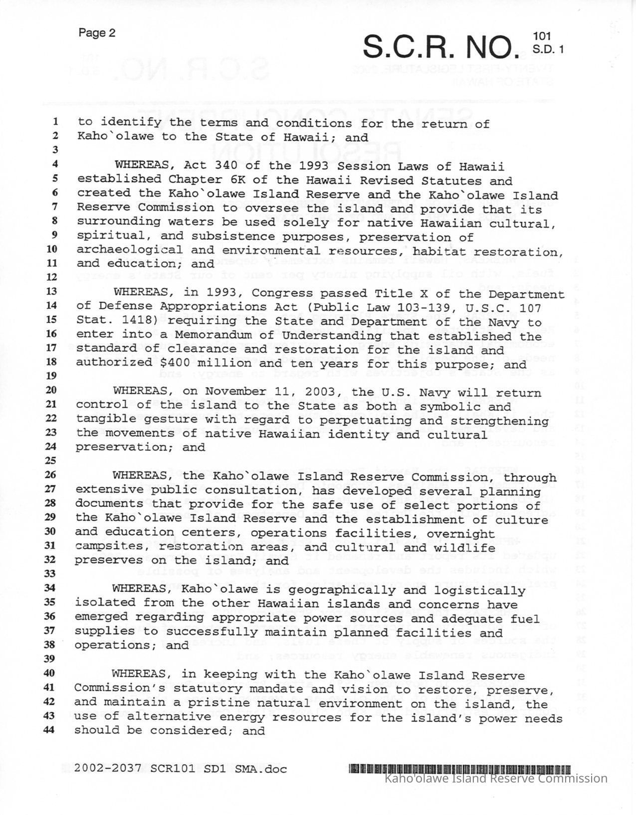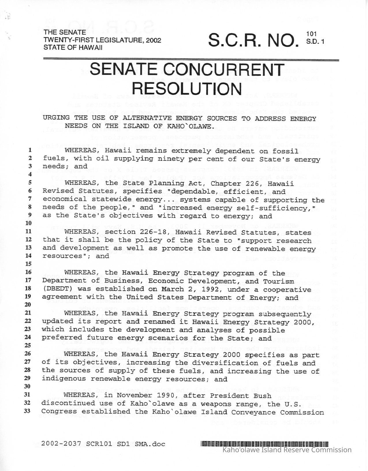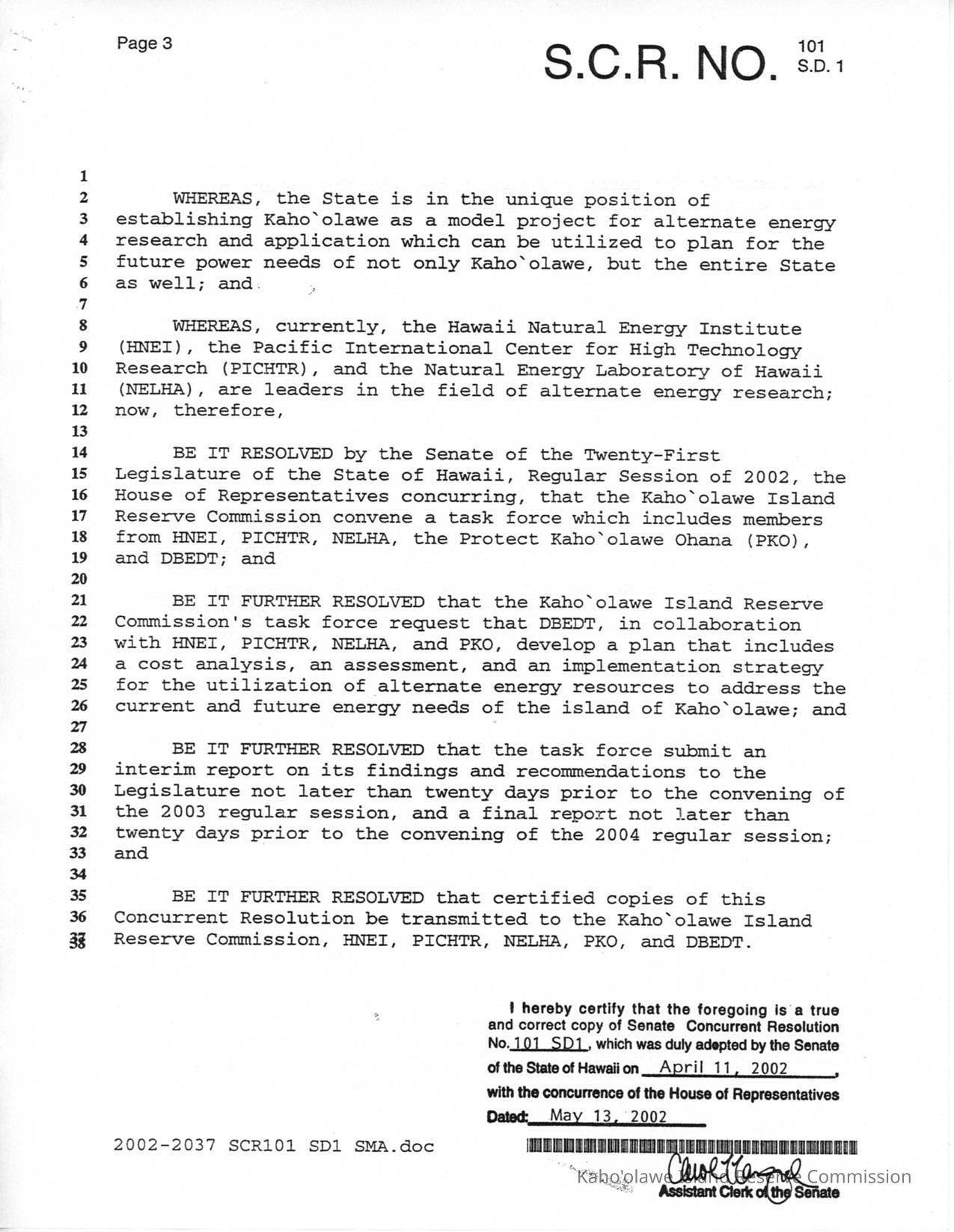 Certified copy of S.C. R. (Senate Concurrent Resolution) No. 101 S. D. (Senate Draft) 1, Senate Concurrent Resolution Urging the Use of Alternative Energy Sources to Address Energy Needs on the Island of Kaho'olawe adopted on April 11, 2002.Creator