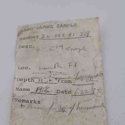 The image displays a small artifact slip with handwritten details beside a foil-wrapped sample in a clear plastic bag.