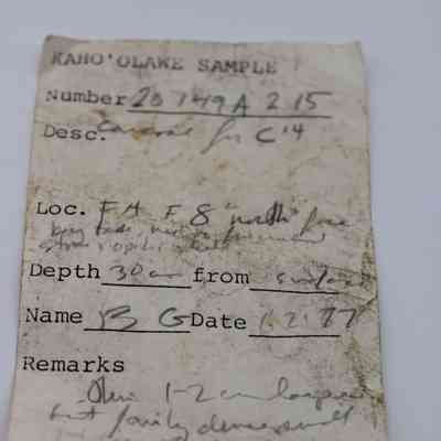 Charcoal sample for C14 sample; fairly dense pieces from the north face of the hearth next to fire-cracked stone and opihi shell.Collection