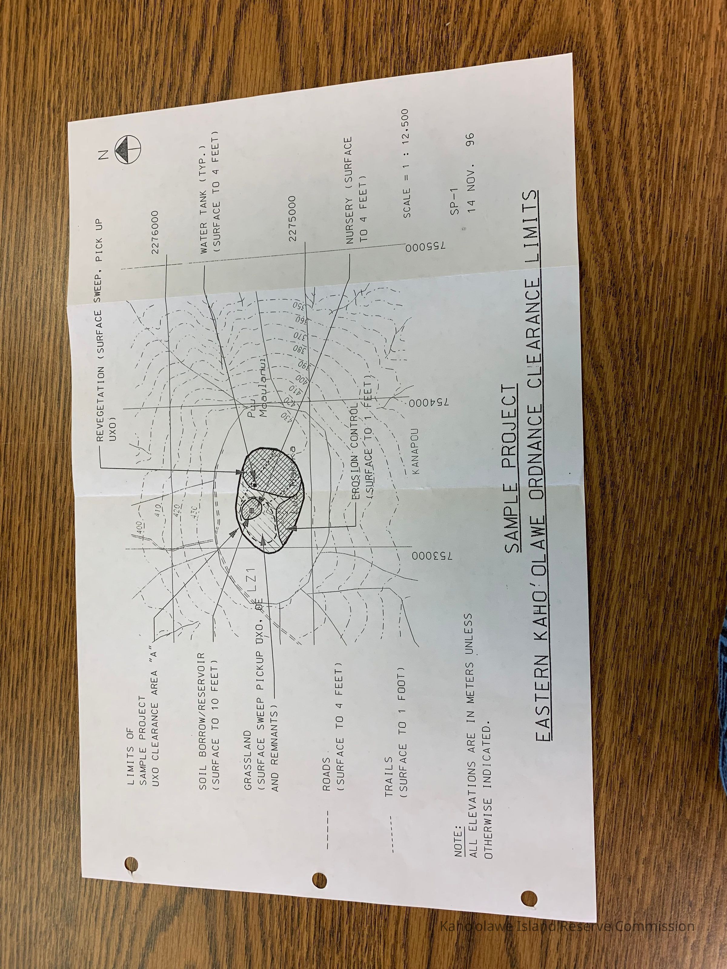 Map of Sample Project, Eastern Kahoolawe Ordnance Clearance Limits. Map of Luamakika and location of grassland, tails, roads, erosion control and water tank.Collection