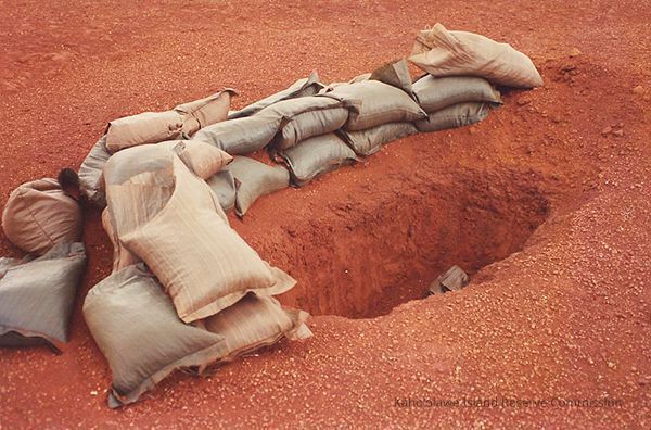 Color photo of a group of sandbags partially surrounding a hole in hard pan with an unknown object inside it.