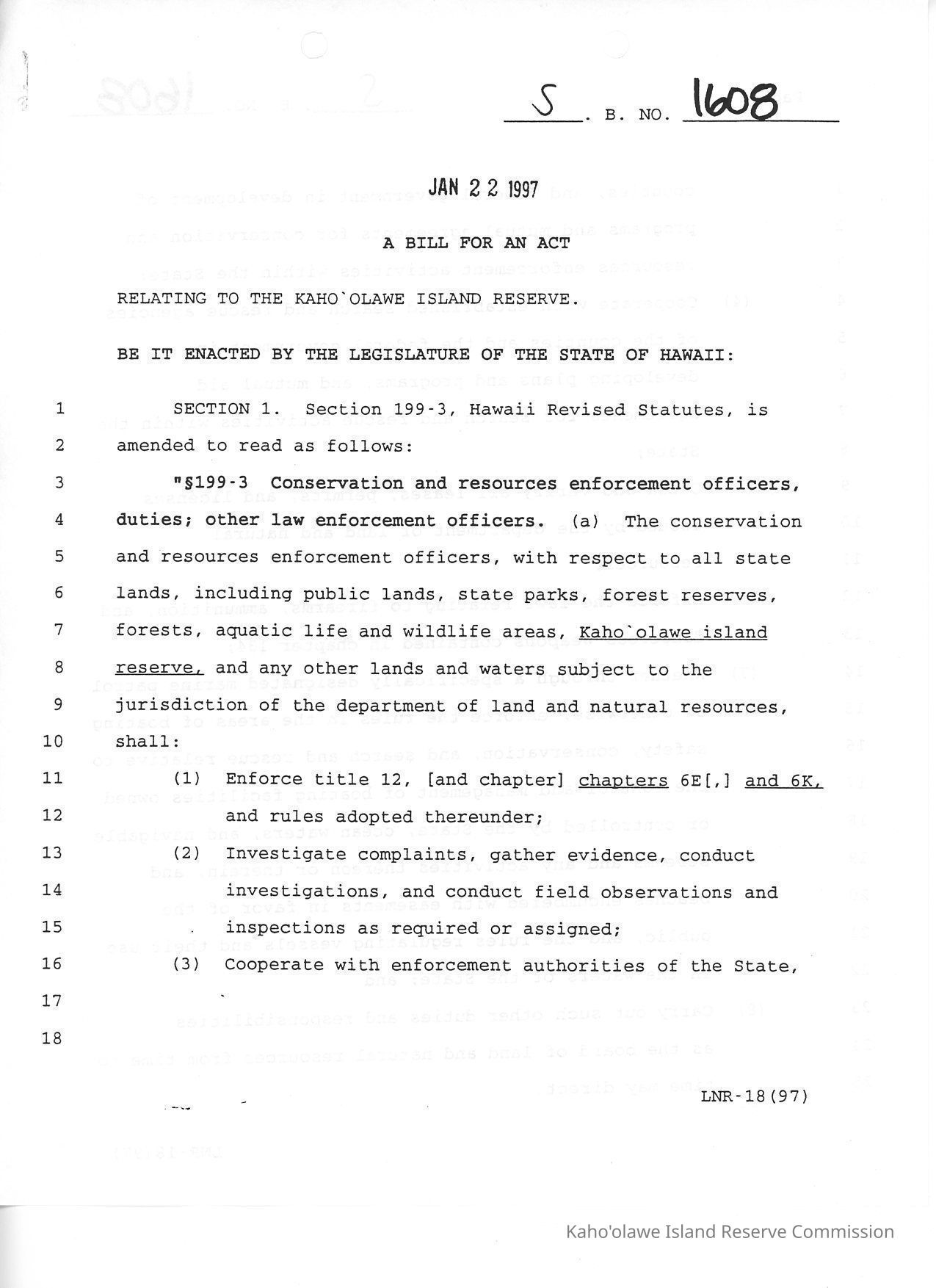 Copy of S.B. No. 1608, A Bill for an Act, Relating to the Kaho'olawe Island Reserve. Act introduced by request. Adds citation of appropriate Hawaii Revised Statutes chapters to enforcement statutes. Excerpt: "The conservation and resources enforcement officers, with respect to all state lands, including public lands, state parks, forest reserves, forests, aquatic life and wildlife areas, Kaho'olawe island reserve, and any other lands and waters subject to the jurisdiction of the department of land and natural resources,"Collection