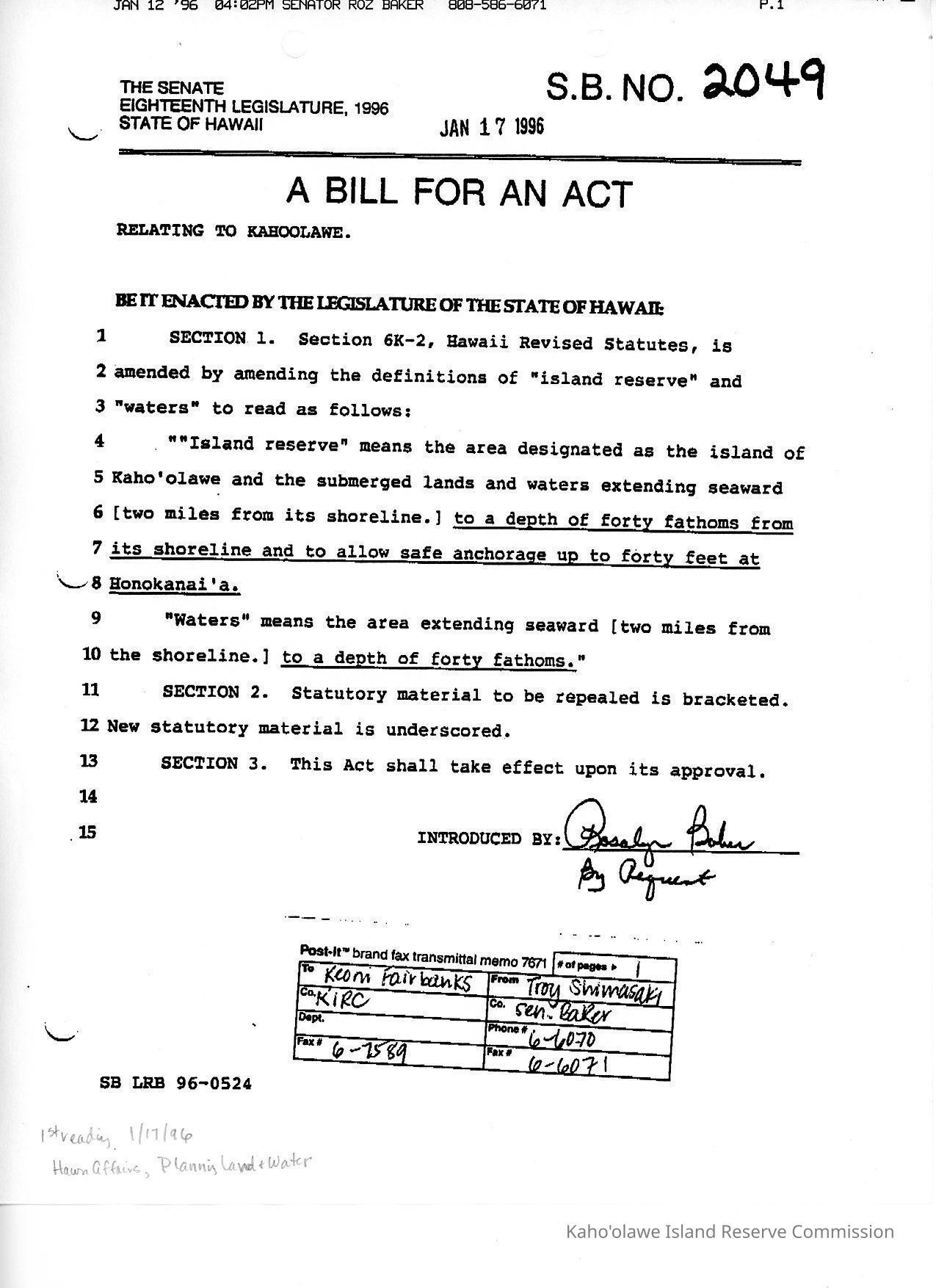 Faxed copy of Senate Bill No. 2049, Relating to Kahoolawe. Faxed from Troy Shimasaki, Senator Baker's office, to Keoni Fairbanks, KIRC ED, on Jan 12, 1996.