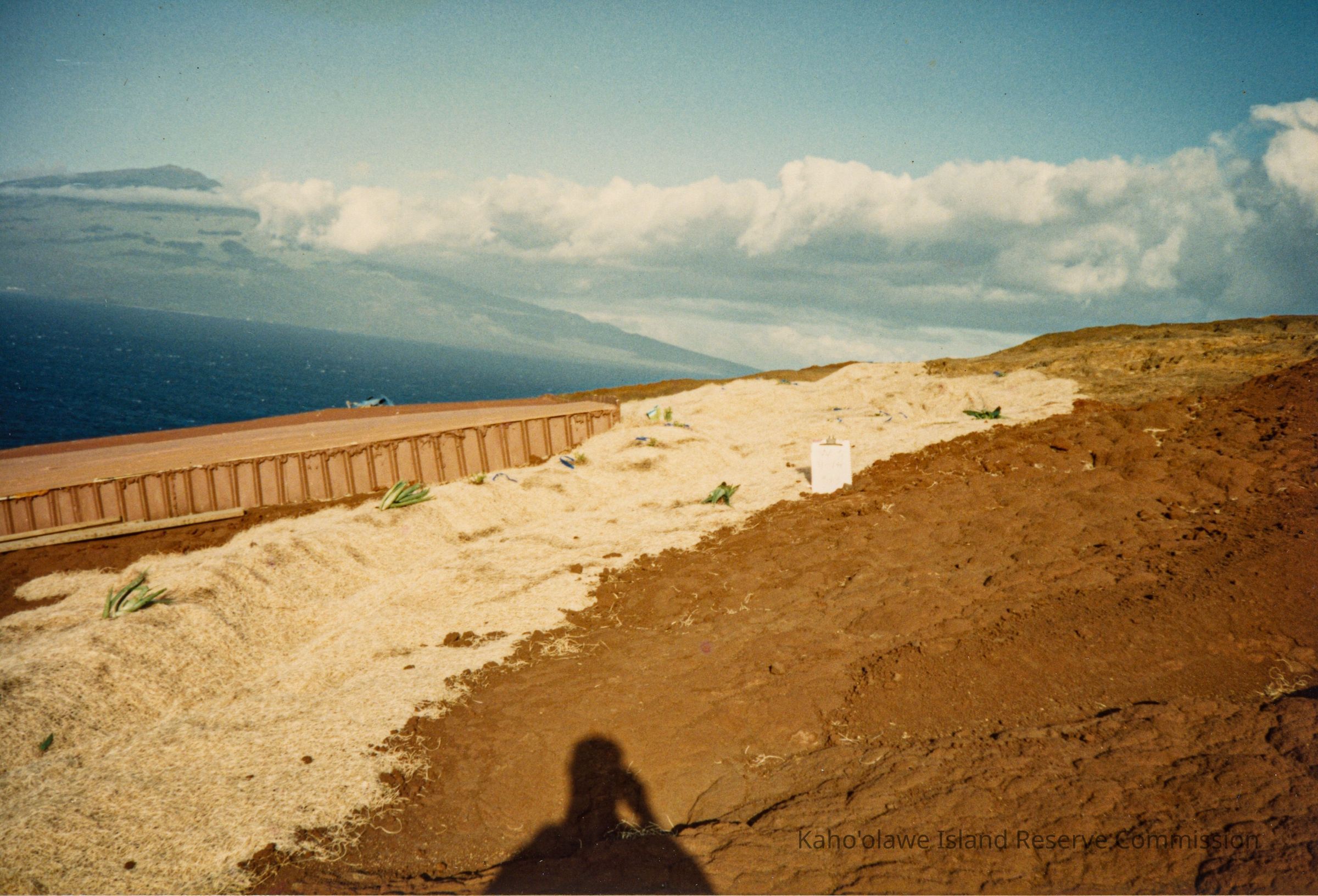 Color photograph of a row of seedlings growing through fiber matting placed on hardpan terrain. There is a clipboard to the right and low brown structure to the left. The ocean and Maui in the background. Handwritten text one previous page in the original photo album states: "March 1994 3 Day Regular Access. Tank Cover Flew Off!"