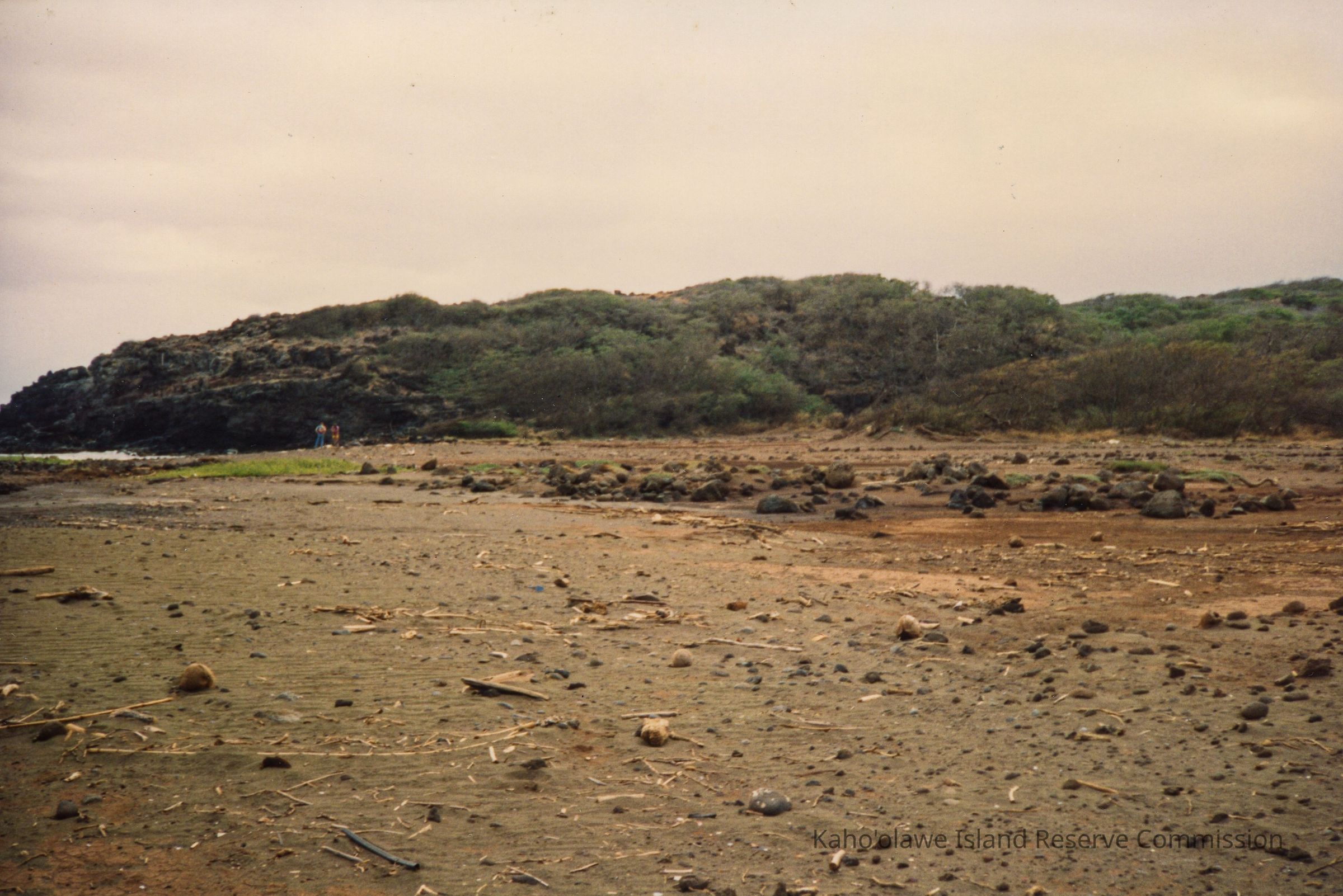 Color photography of rocky and semi-rocky terrain with small hills in the background. There are two unidentified people in the far distance. This photo may have been taken in Hakioawa.