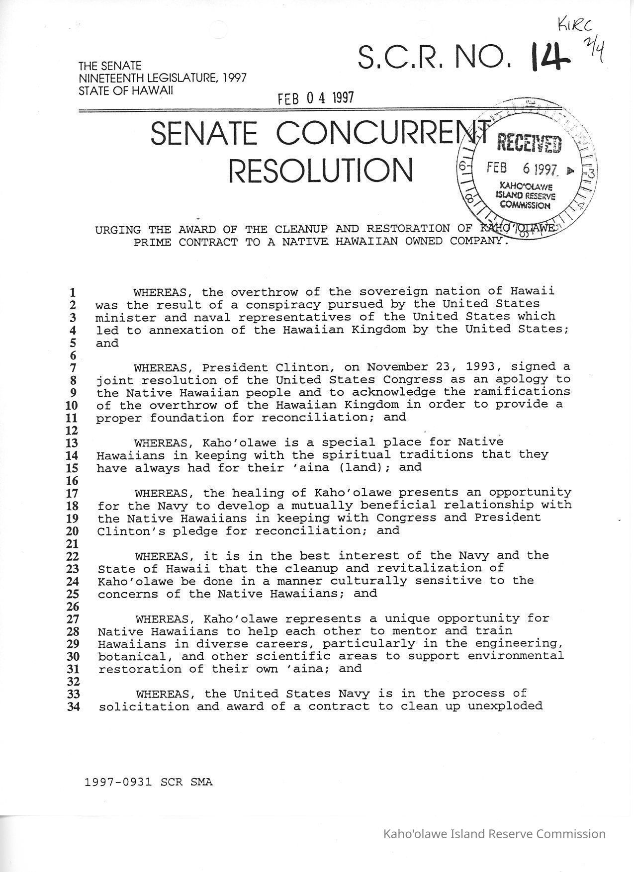 Copy of Senate Concurrent Resolution (SCR) No. 14 Urging the Award of the Cleanup and Restoration of Kaho'olawe Prime Contract to a Native Hawaiian Owned Company. Received by the Kaho'olawe Island Reserve Commission on 6 February 1997. Three letter sized copied pages.Creator