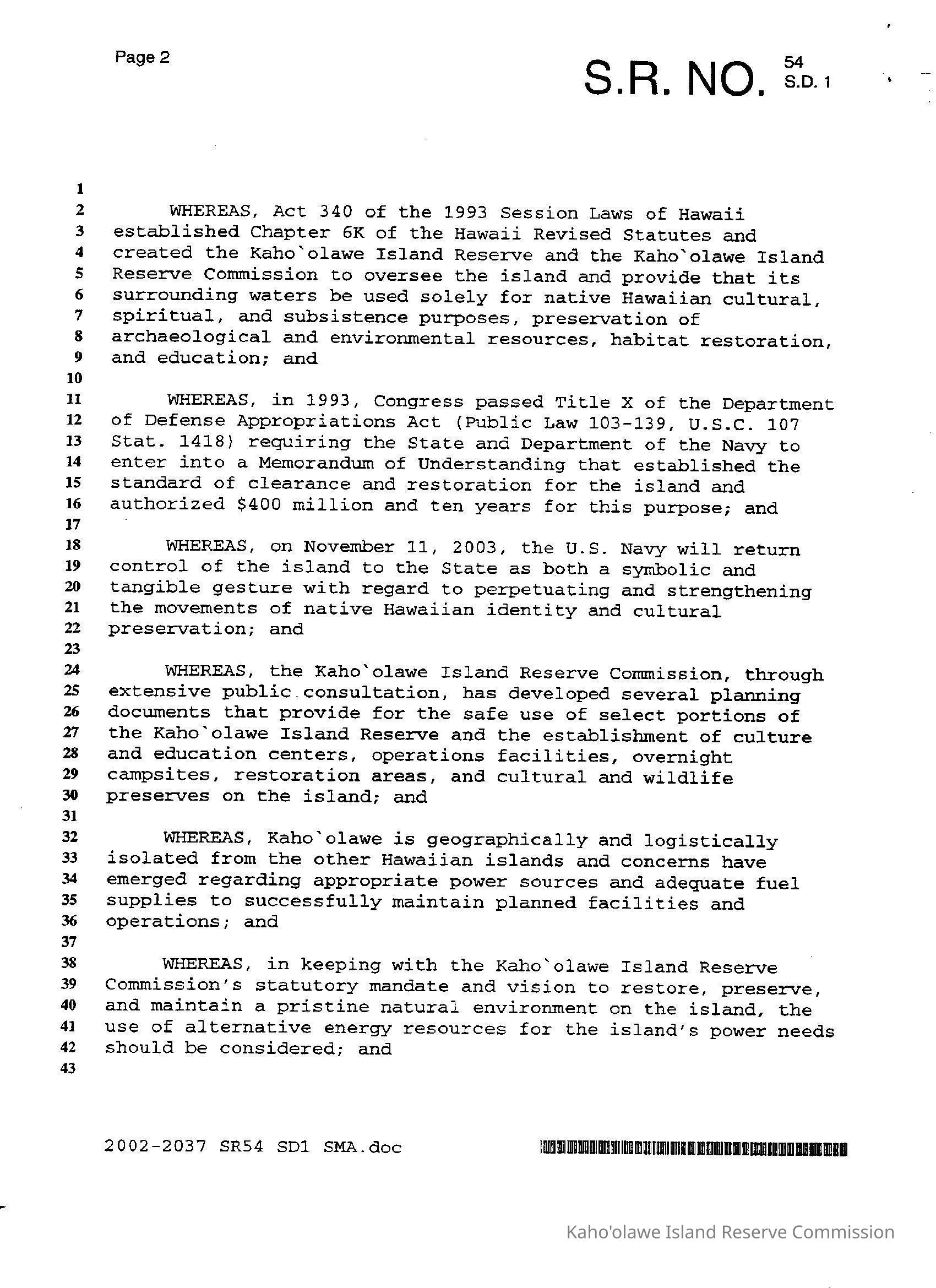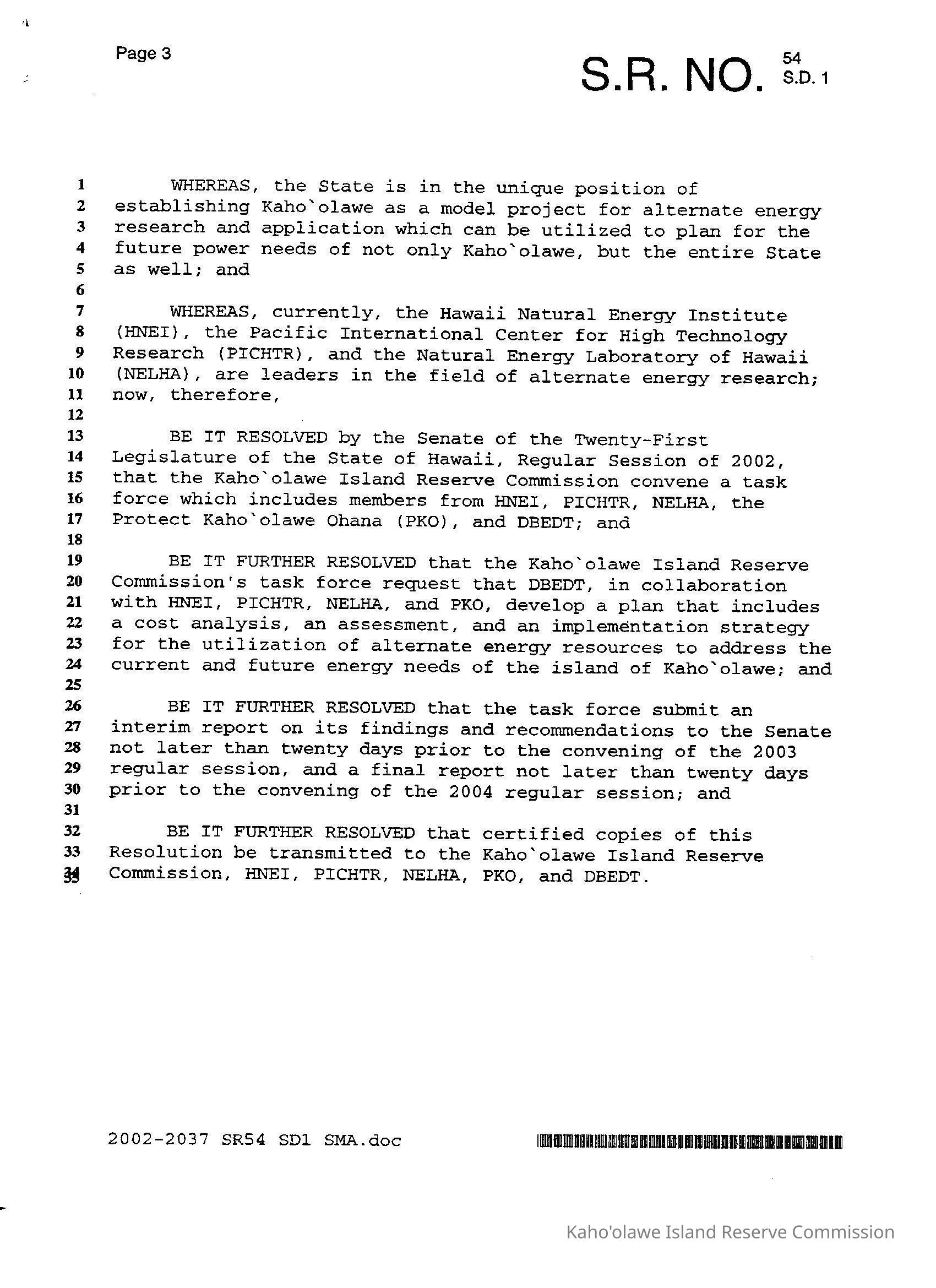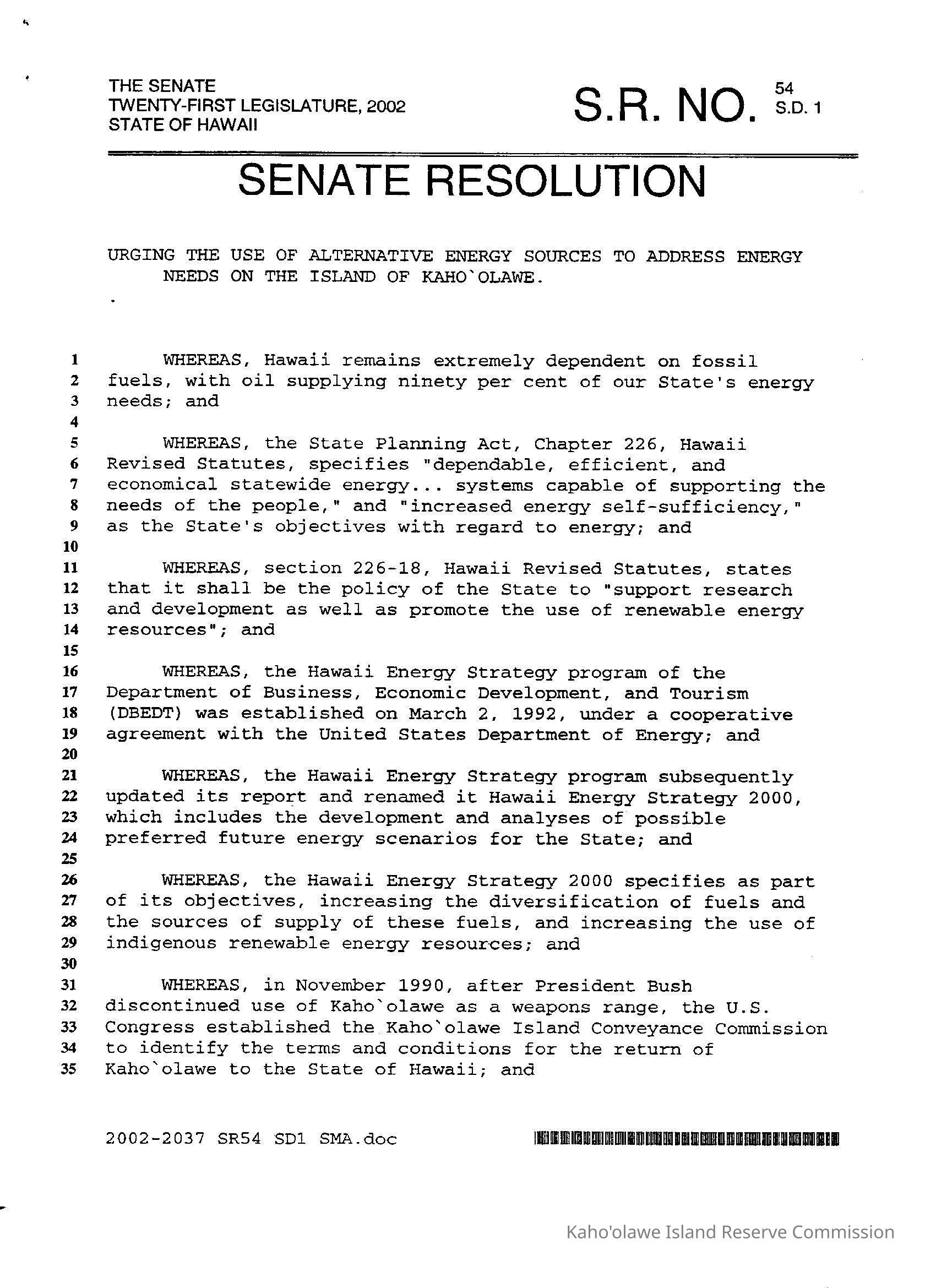 Copy of S.R. No. 54 S.D. (Senate Draft) 1, Senate Resolution Urging the Use of Alternative Energy Sources to Address Energy Needs on the Island of Kaho'olawe.Container