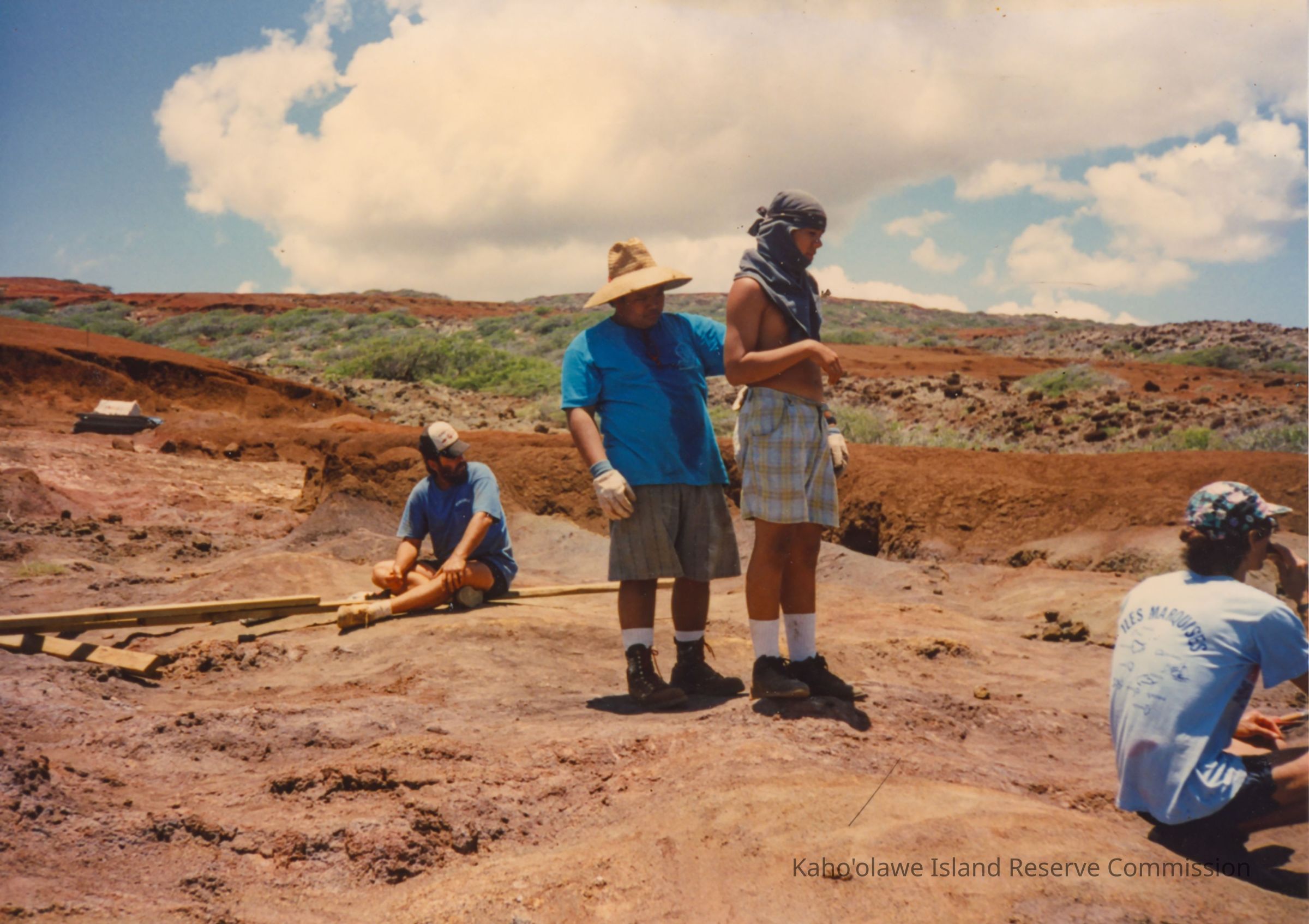 Color photo of four unidentified men sitting and standing on hardpan terrain. This photo may have been taken during the water catchment construction PKO (Protect Kaho'olawe 'Ohana) access in Wailuna, Hakioawa 'Ili.Photograph Details