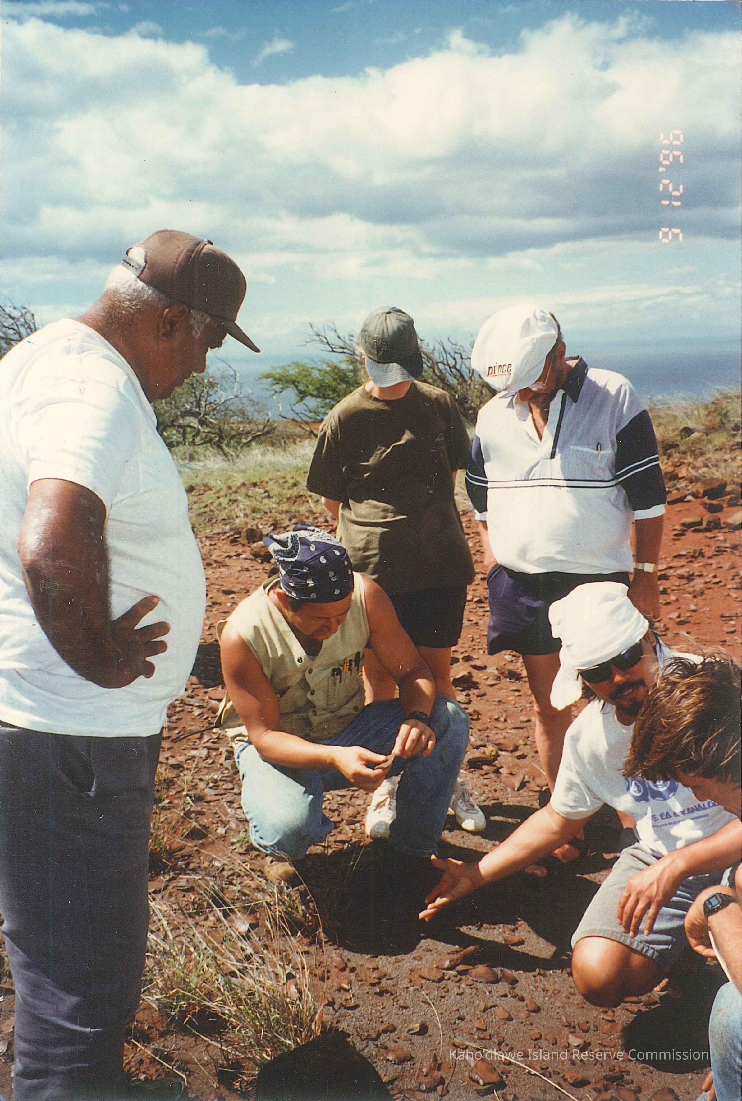 Color photo of several people examining an archaeological site. Left to right: Rene Sylva, Paul Higashino, unidentified, unidentified, Sam Gon III, Thomas Giambelluca.Collection