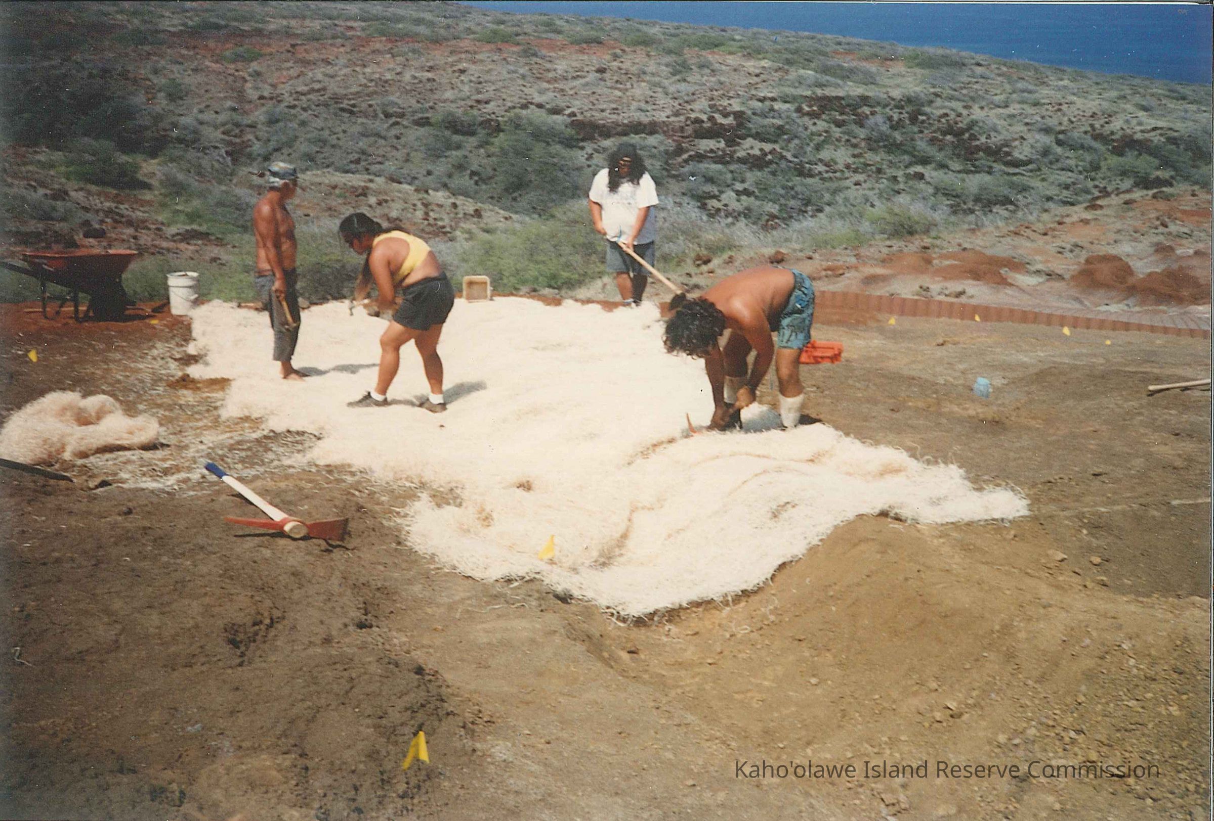 Four people are working together on a dry, hilly landscape, spreading out a fibrous material over the ground.