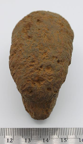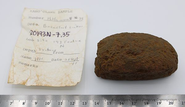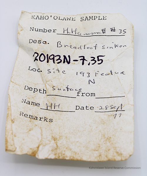 Bread loaf sinker with artifact slip and ruler: The image shows a weathered rock in the shape of a bread loaf next to a labeled, worn note, indicating details like location and depth, all placed above a ruler.