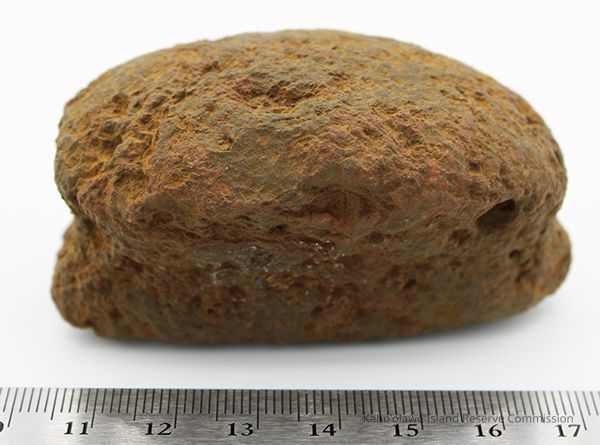 The image shows a weathered rock in the shape of a bread loaf next to a labeled, worn note, indicating details like location and depth, all placed above a ruler.