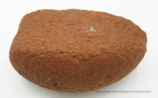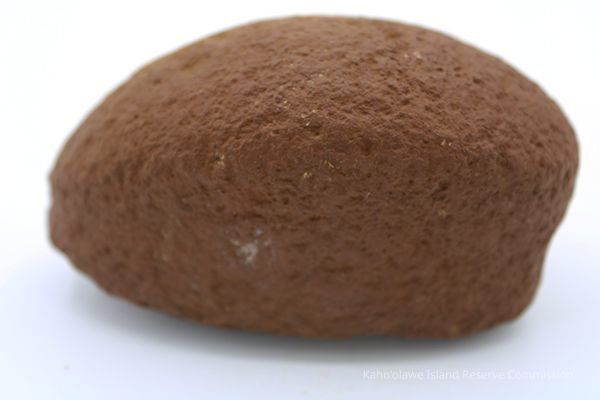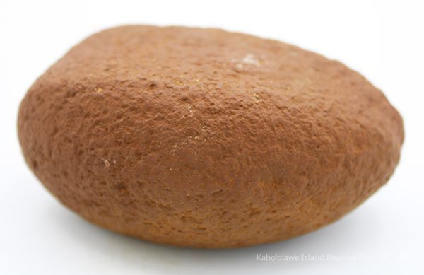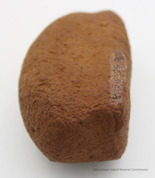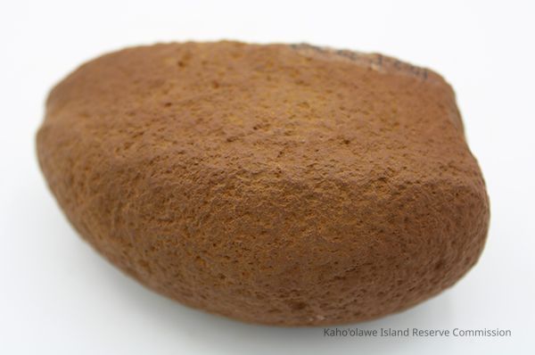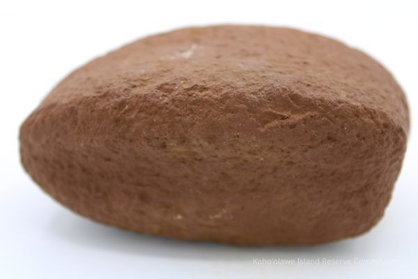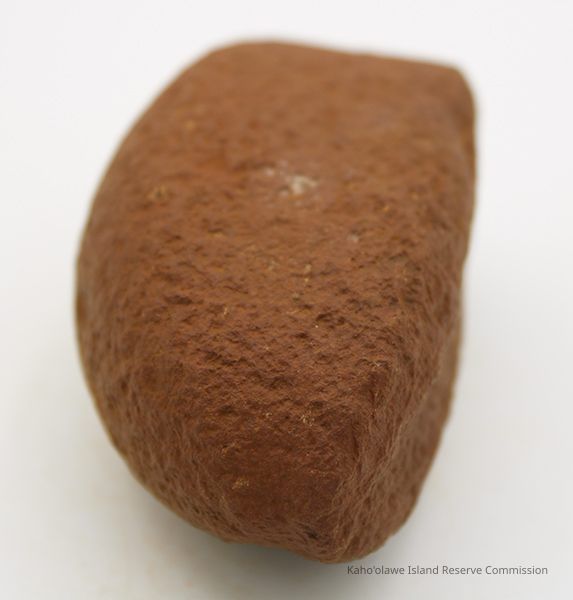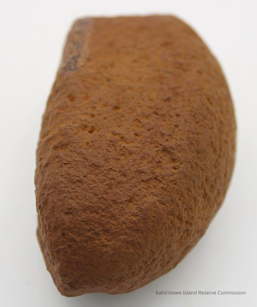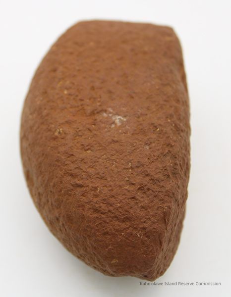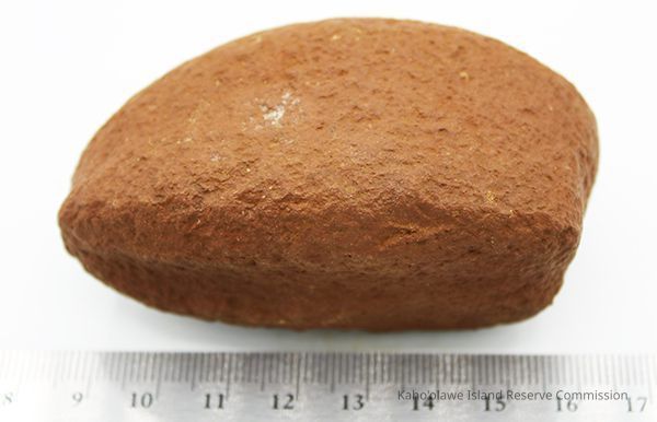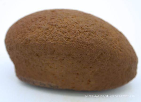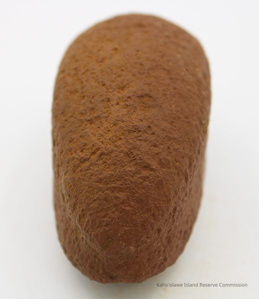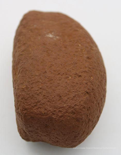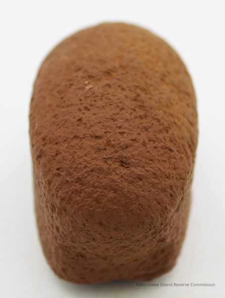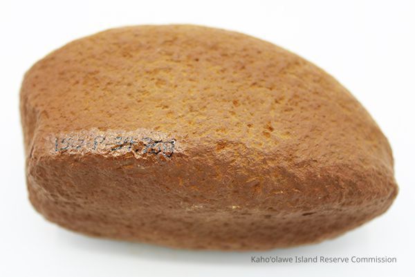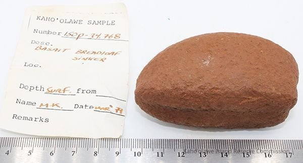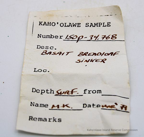 Basalt, breadloaf sinker with alternate id # handwritten in black ink on one side. This sinker was for a cowrie shell lure (according to the site description written during 1977-1980 Kaho'olawe Archaeological Survey).
