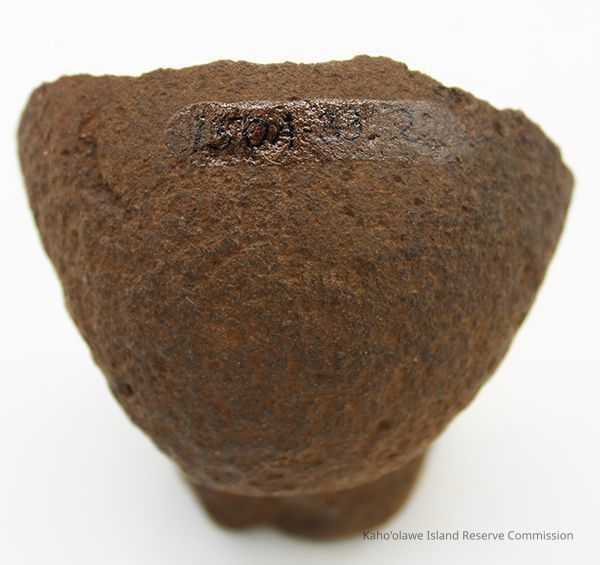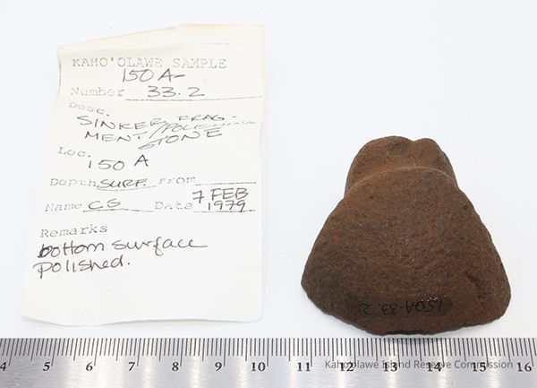 Half of either a sinker or a polishing stone with alternate id number handwritted in black ink on the top of one side and a polished bottom. It a basalt "grooved" type per artifact record sheet.