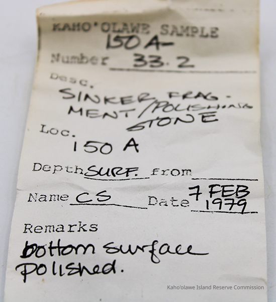 Grooved type sinker fragment or polishing stone w/artifact slip: The image shows a stone artifact labeled as a sinker fragment or polishing stone, with accompanying documentation detailing its classification and discovery date.