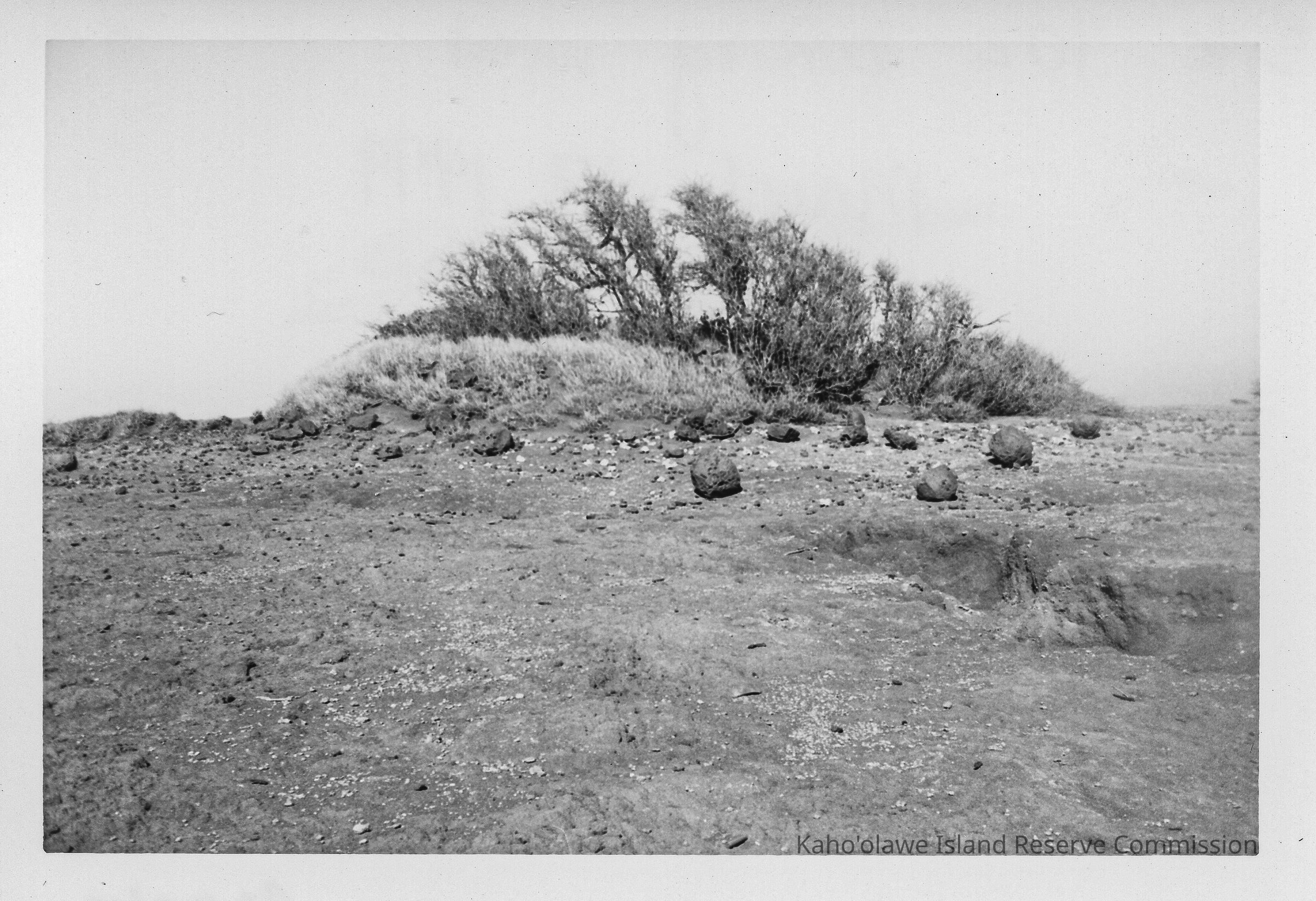 In the image, a desolate habitation site is depicted with uneven ground, scattered rocks, sparse grasses, and a cluster of leafless trees on top of a hummock.