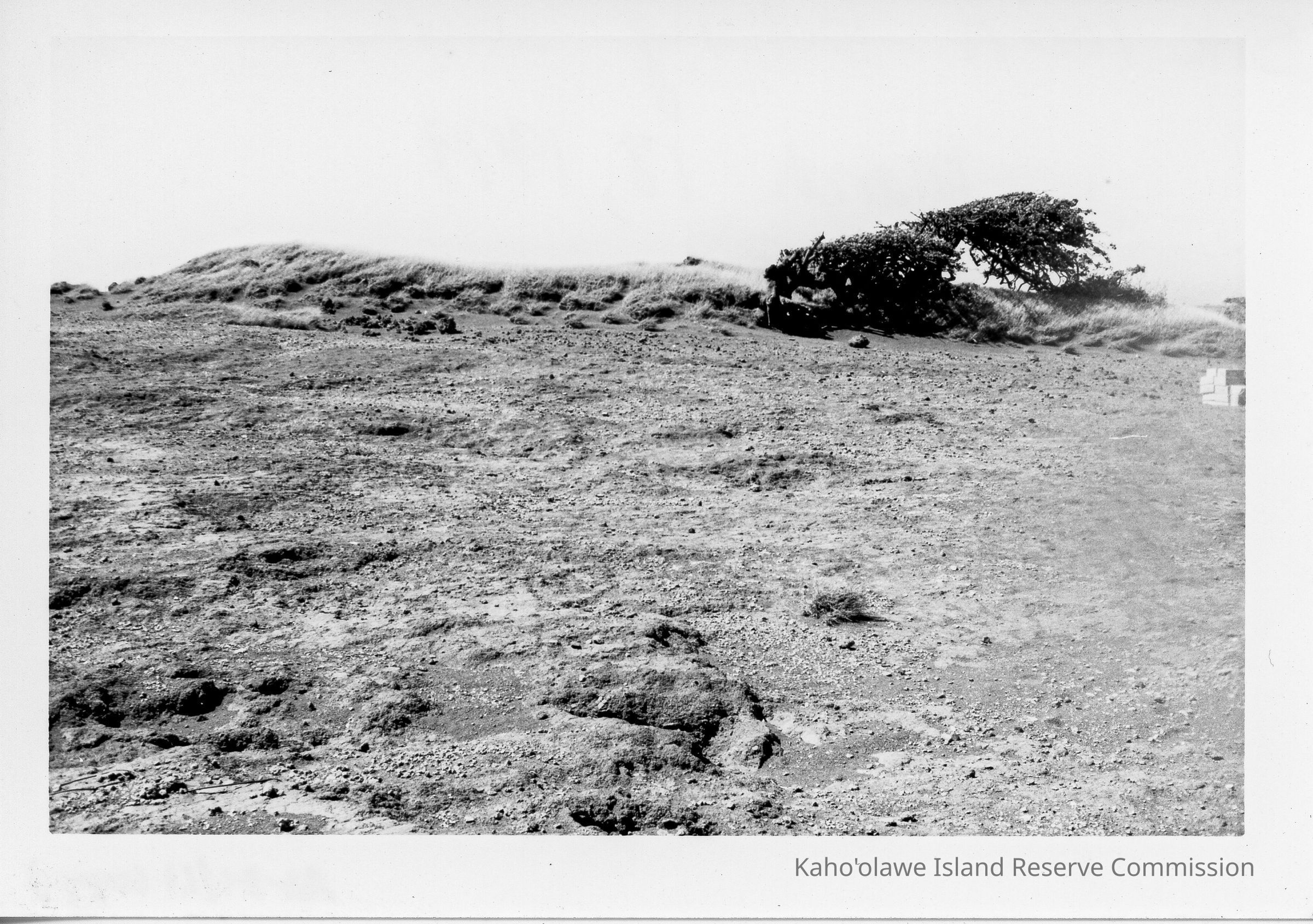 The black and white photograph depicts a barren landscape with sparse vegetation and a tree bent by the wind against a stark sky.