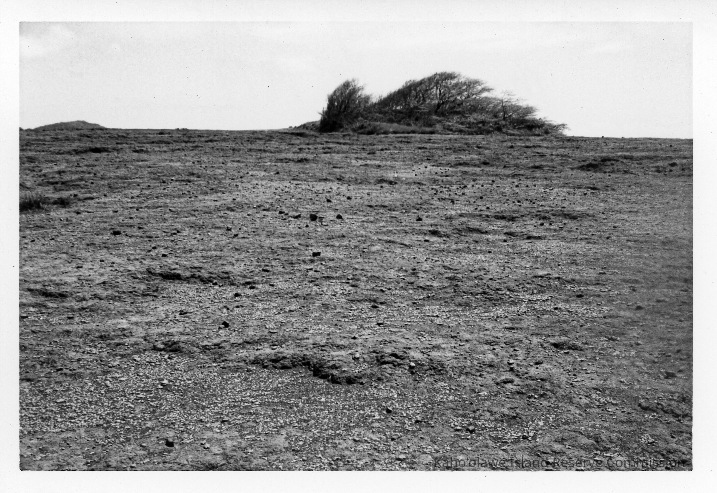 Black & white photo of Site 103, Feature E looking east with several windswept trees in the background. The photo was taken on the slopes of Luamakika, approximately 1500 meters southeast of Pu'u 'O Moa'ulanui.Photograph Details