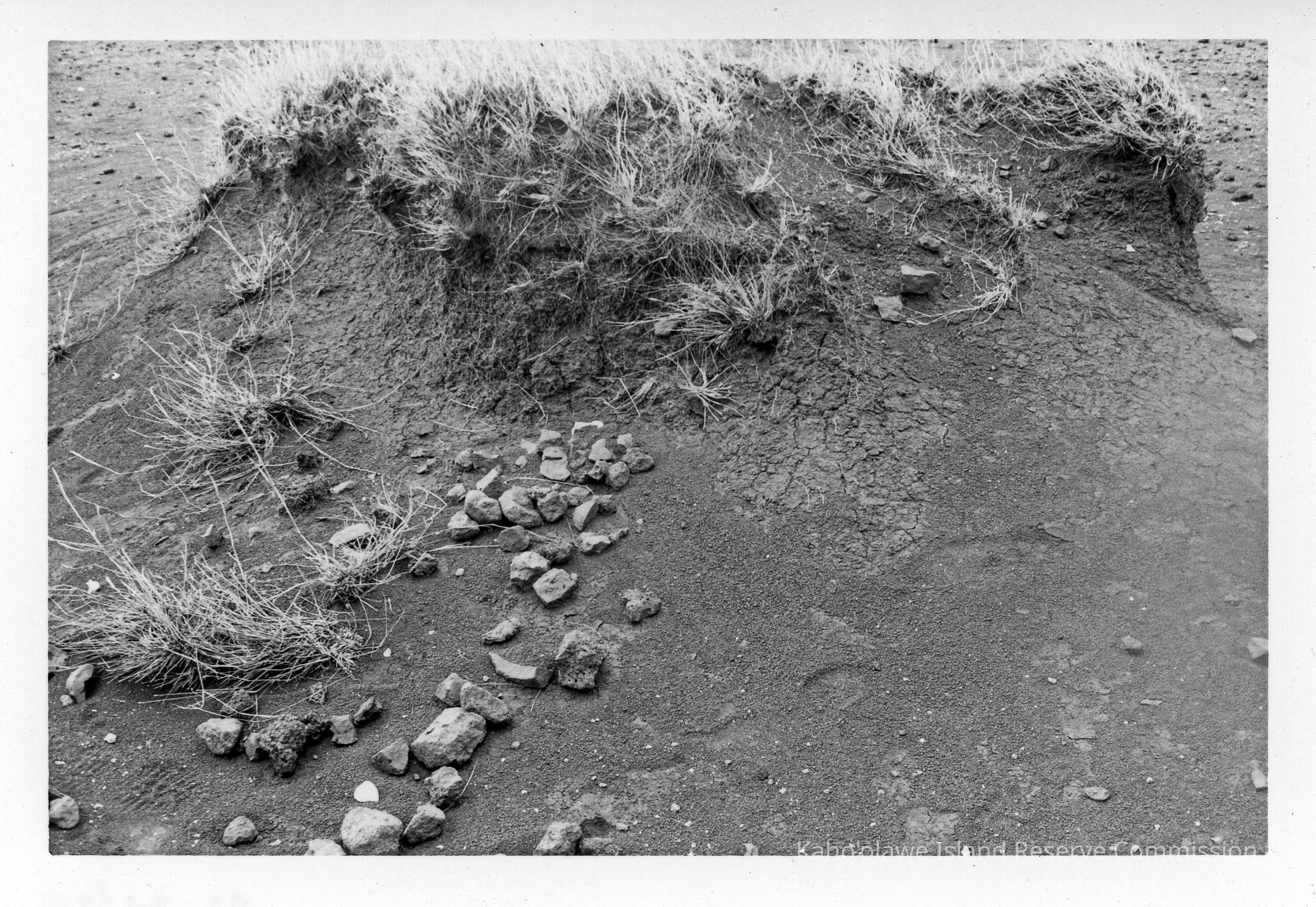 The black and white image shows an eroded landscape with dry grass and scattered rocks on cracked, dry soil.