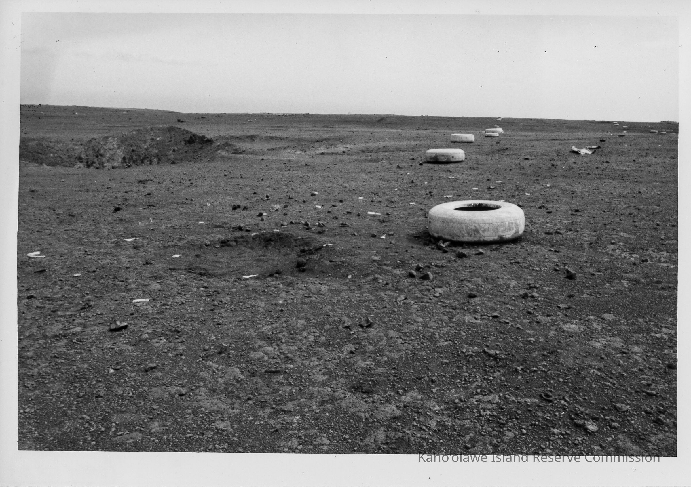 The black and white image shows a barren landscape scattered with old, abandoned tires laid out across the ground.