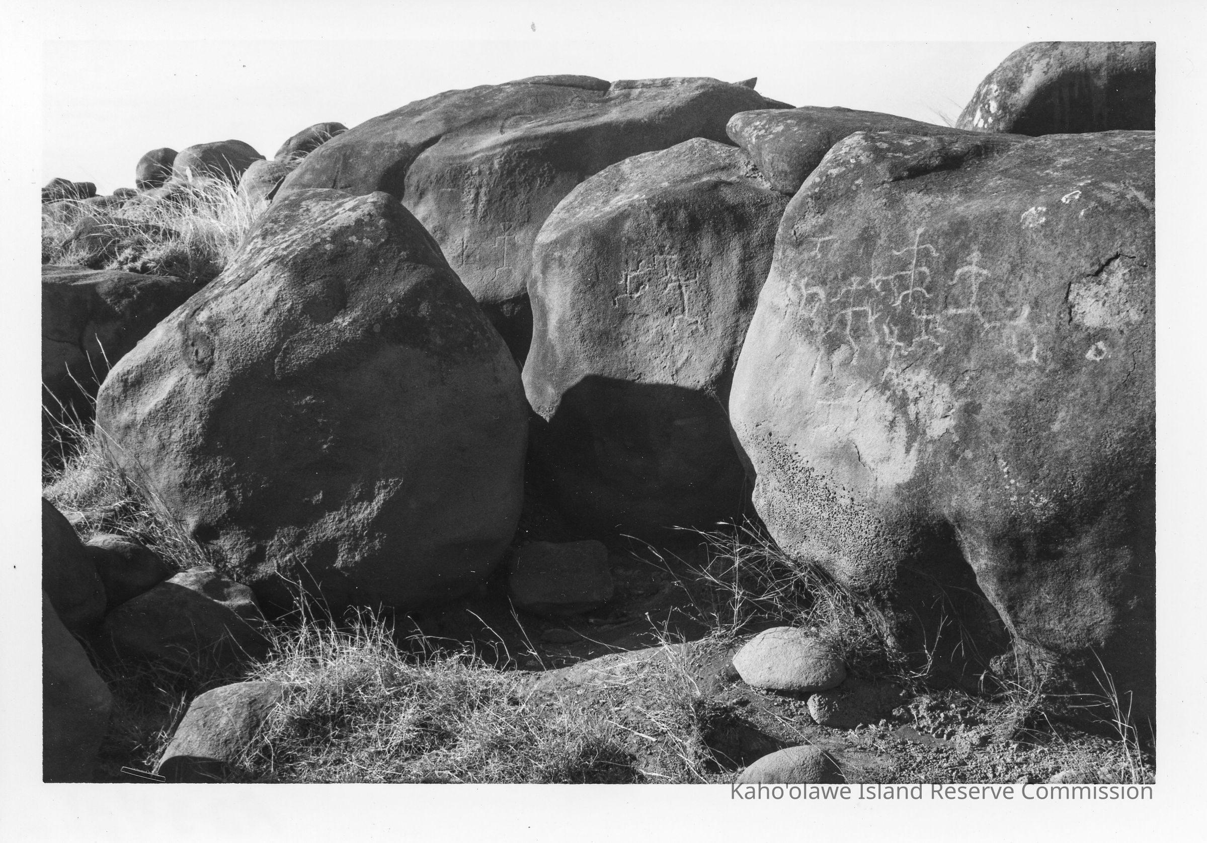 Petroglyphs (ki'i pōhaku) on several large boulders: The black and white photograph shows a collection of large boulders, some with petroglyph carvings, surrounded by grass.