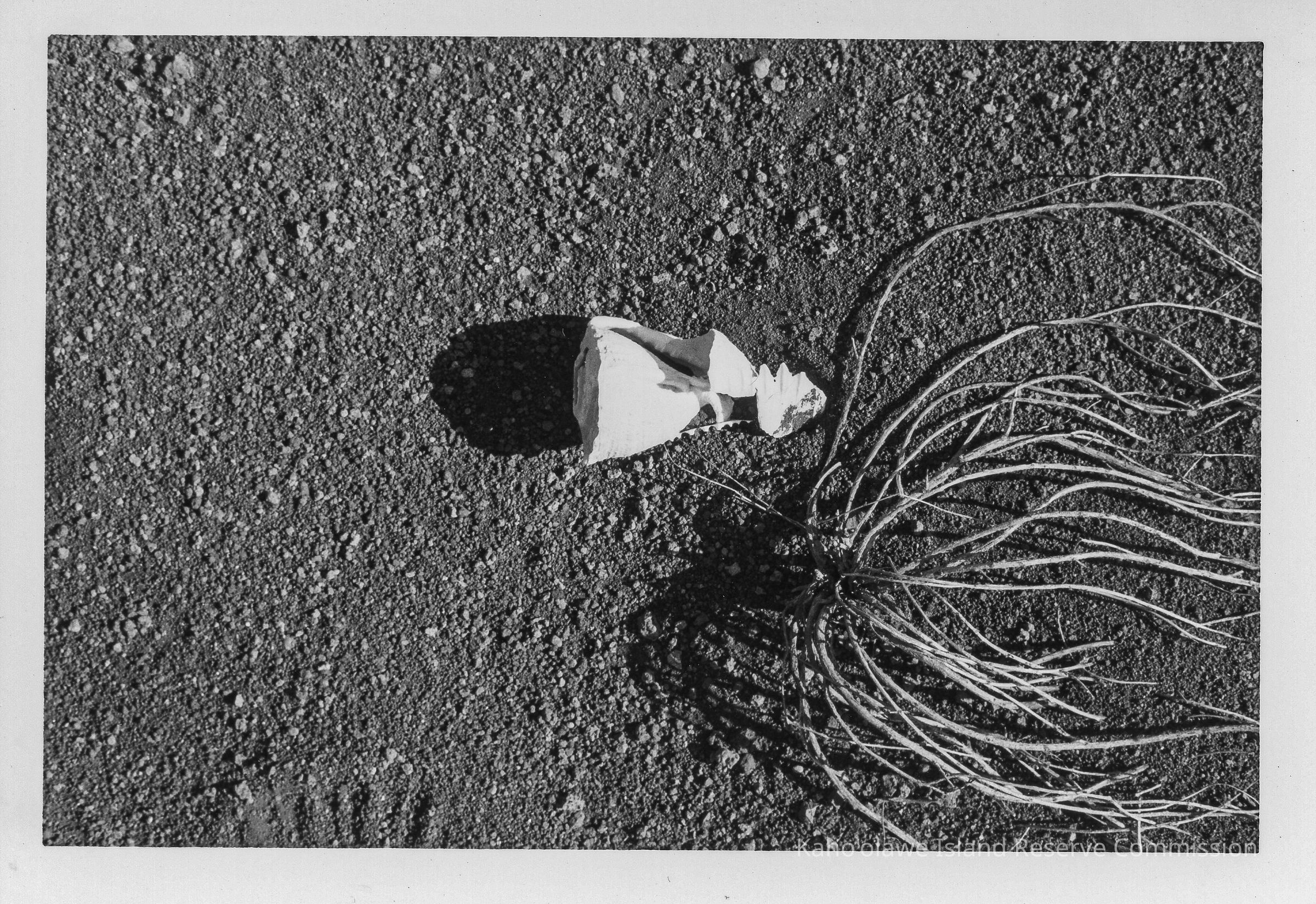 Black & white photo of Site 110 Feature BG with shell next to plant facing northwest. Photo taken near the head of Kanaloa Gulch, Kūnaka/Naalapa 'Ili, Kaho'olawePhotograph Details