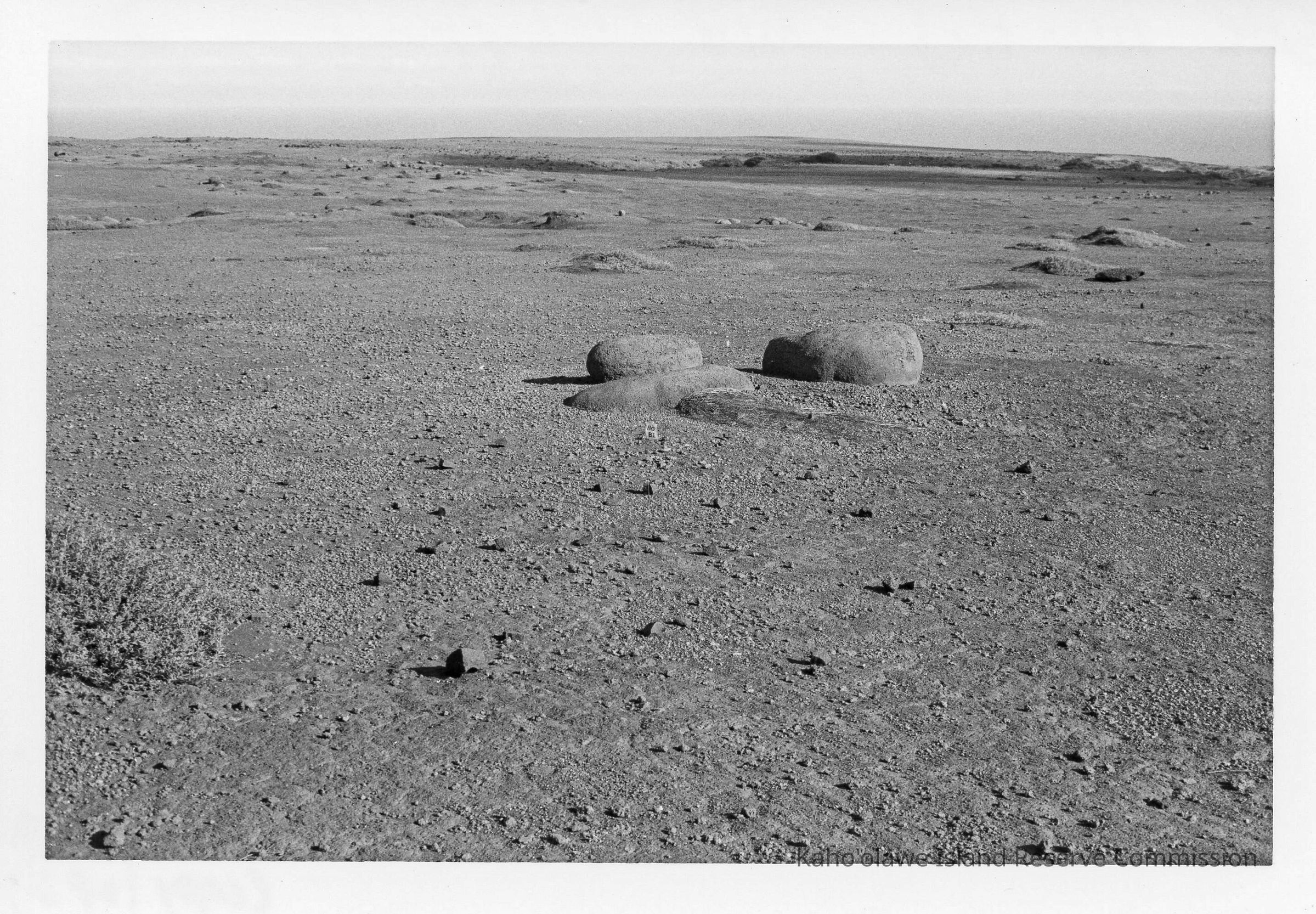 Black & white photos of Site 110, Feature BJ, facing northeast with boulders in the middle. There are two copies. Photo taken near the head of Kanaloa Gulch, Kūnaka /Naalapa 'Ili, Kaho'olawe.Photograph Details