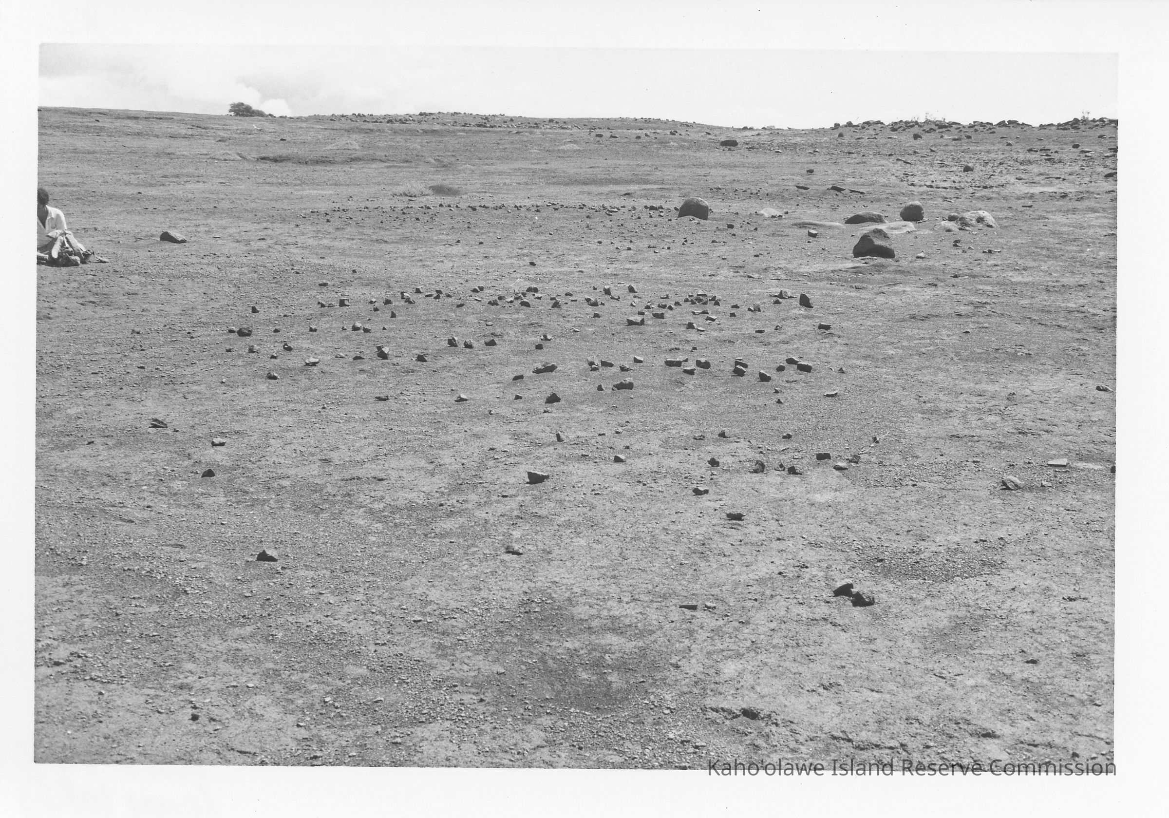 Black & white photo of Site 110, Feature BT, facing northeast with unidentified man on the left side. There are two copies. Photo taken near the head of Kanaloa Gulch, Kūnaka/Naalapa 'Ili, Kaho'olawe.Photograph Details