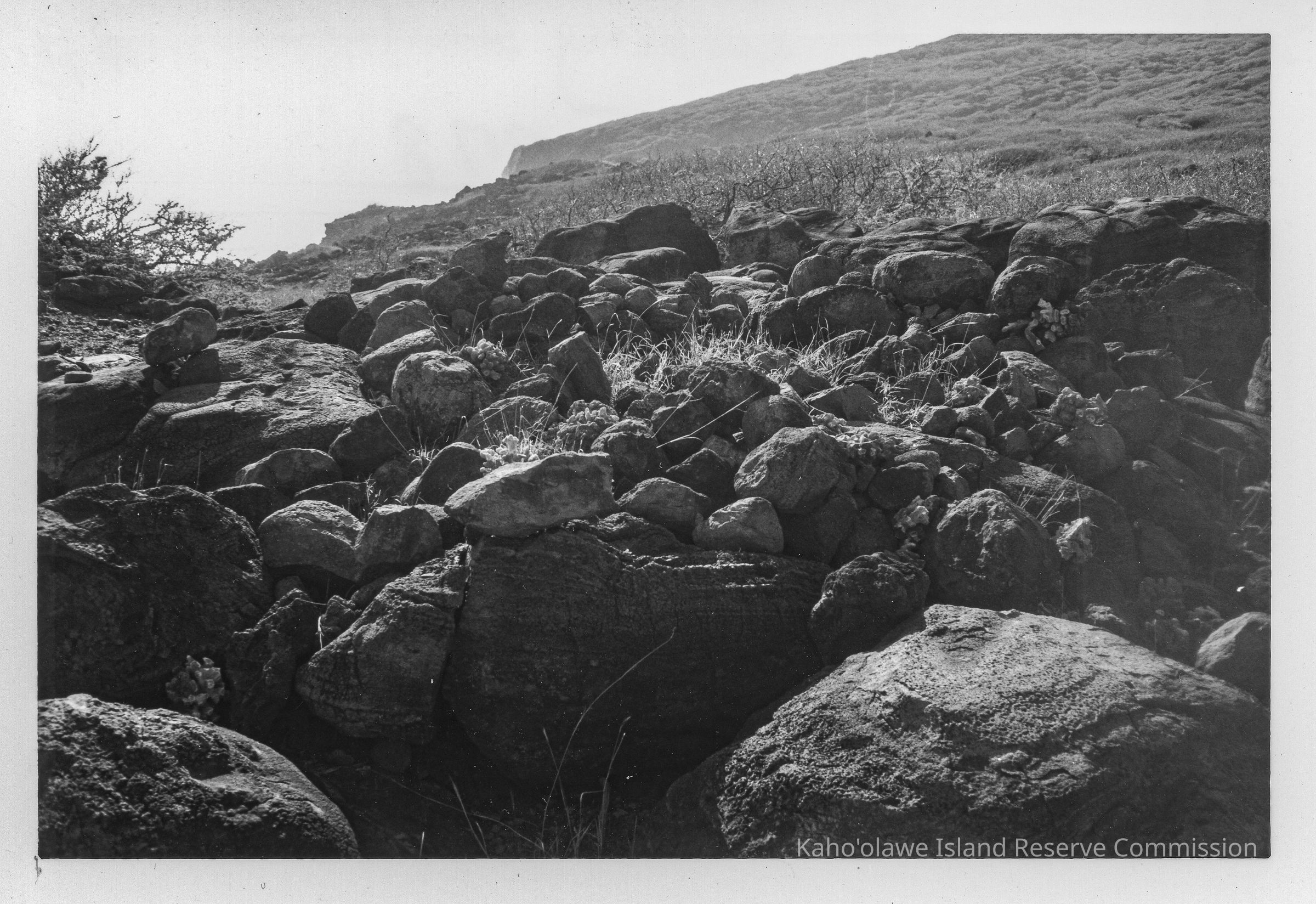 Black & white photo of Feature A, a possible ko'a (shrine) or heiau (traditional place of worship) at Site 348 with the ocean in the background. The image was taken at the top of the eastern side of the Hakioawa south gulch, Hakioawa 'Ili, Kaho'olawe. This potential shrine may be associated with Aiai according to Na Wahi Pana 'O Kaho'olawe, KICC Consultant Report No. 17. There are two copies.Photograph Details