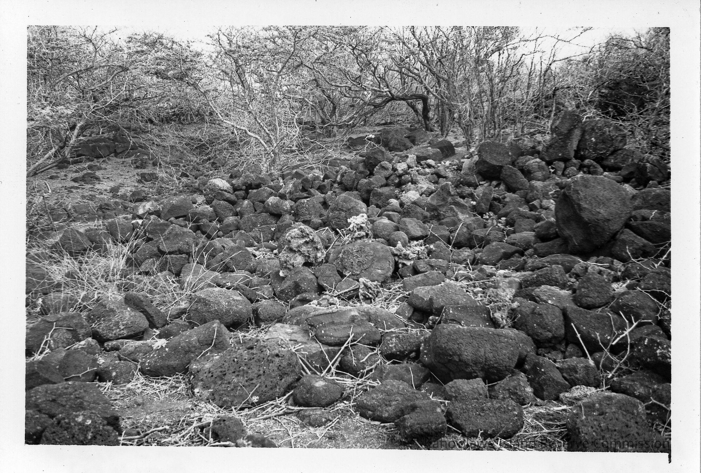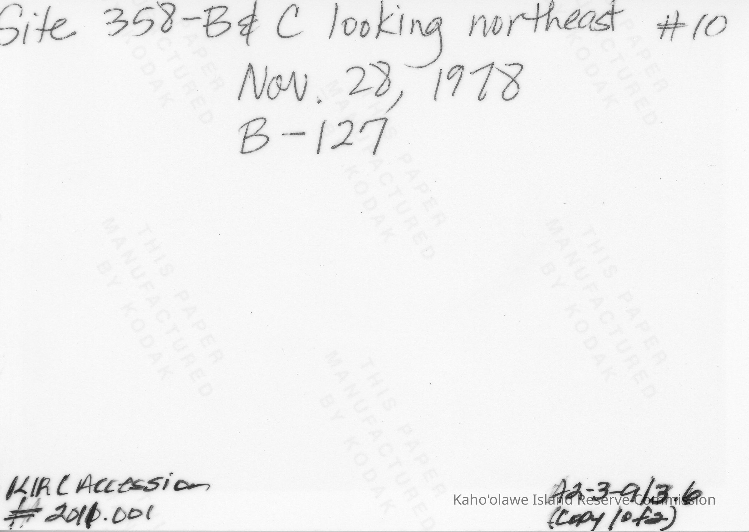 Black and white photo of terrace (Feature B) and platform (Feature C) at Site 358 (Hale Mua) along western edge of south ridge in Hakioawa Bay area, Hakioawa 'Ili, Kaho'olawe. There is handwritten text in black ink on the back of copy 1.Photograph Details