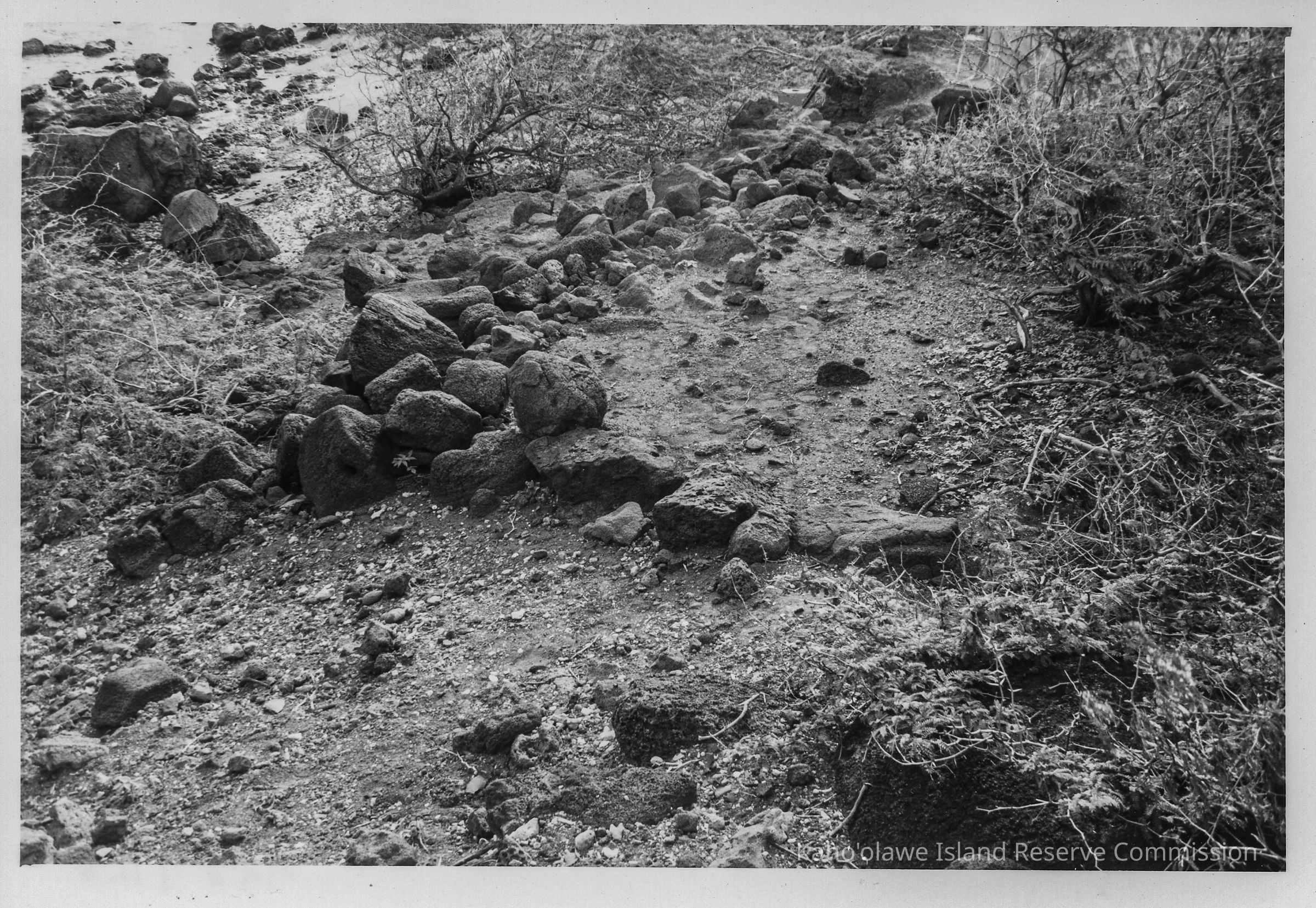 Black & white photo of a C-shape wall at Site 363 (Feature F) facing east. Photo taken near southwest ridge of Honoko'a Bay, Kaho'olawe. In general, C-shapes are thought to be temporary habitation structures, especially when found in conjunction with other, more complex (implying more permanent) structural habitation features.Photograph Details