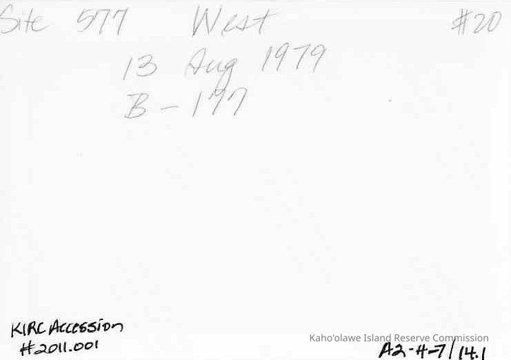 Black and white photo looking west of a thin midden scatter at Site 577. The site is between Aikupau and Hakioawa. The photo has handwritten text in black ink on the back.