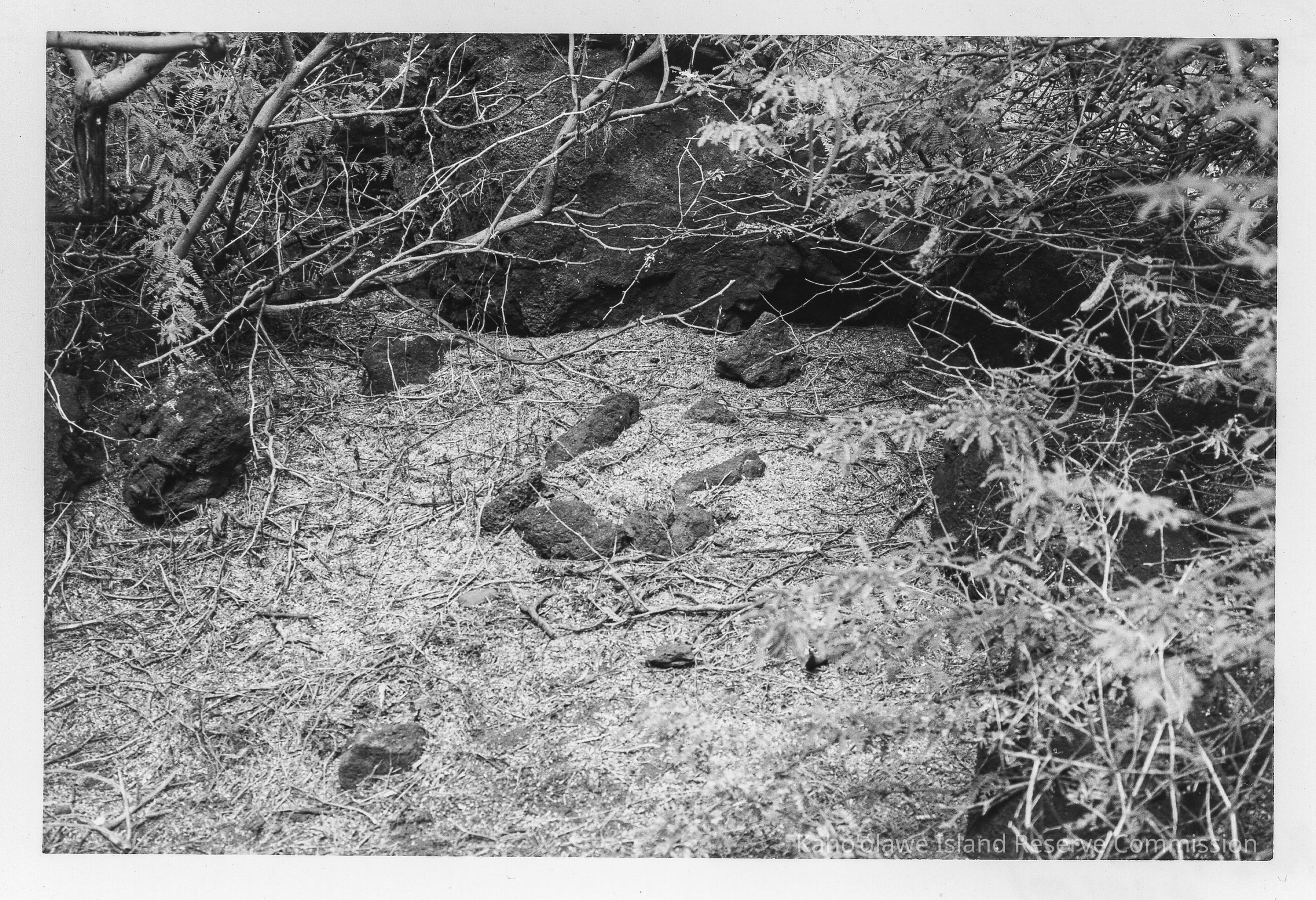 Black and white photo of a slab lined firepit at Site 636 (Feature H) facing north. Image taken midway between Lae 'O Kuikui and Hakioawa, Aikupau, Hakioawa 'Ili.Photograph Details