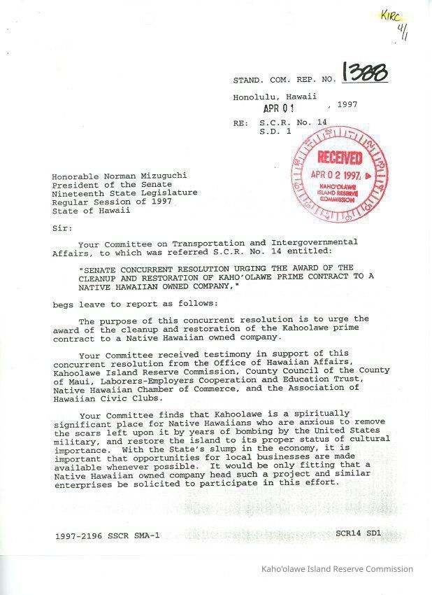 Archivist's Notes: Originally listed in 1997 Legislation-Kaho'olawe Bills That Didn't Pass object report; original object report lost after server update (prior to PastPerfect).