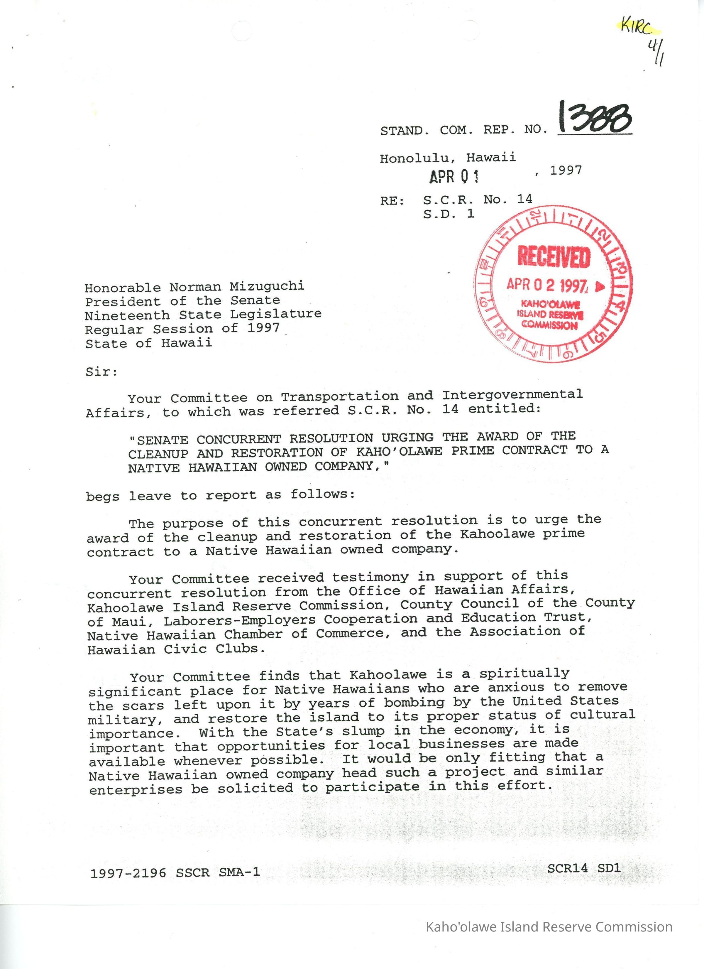 Standing Committee Report No. 1388 re: S.C.R. No. 14, S.D.1. (2 sided copy ) with Record of Votes of the Committee on Transportation and Intergovernmental Affairs dated 18 March 1997. 3 copied typed pagesCreator