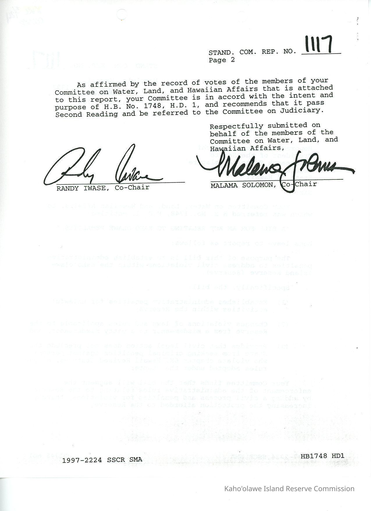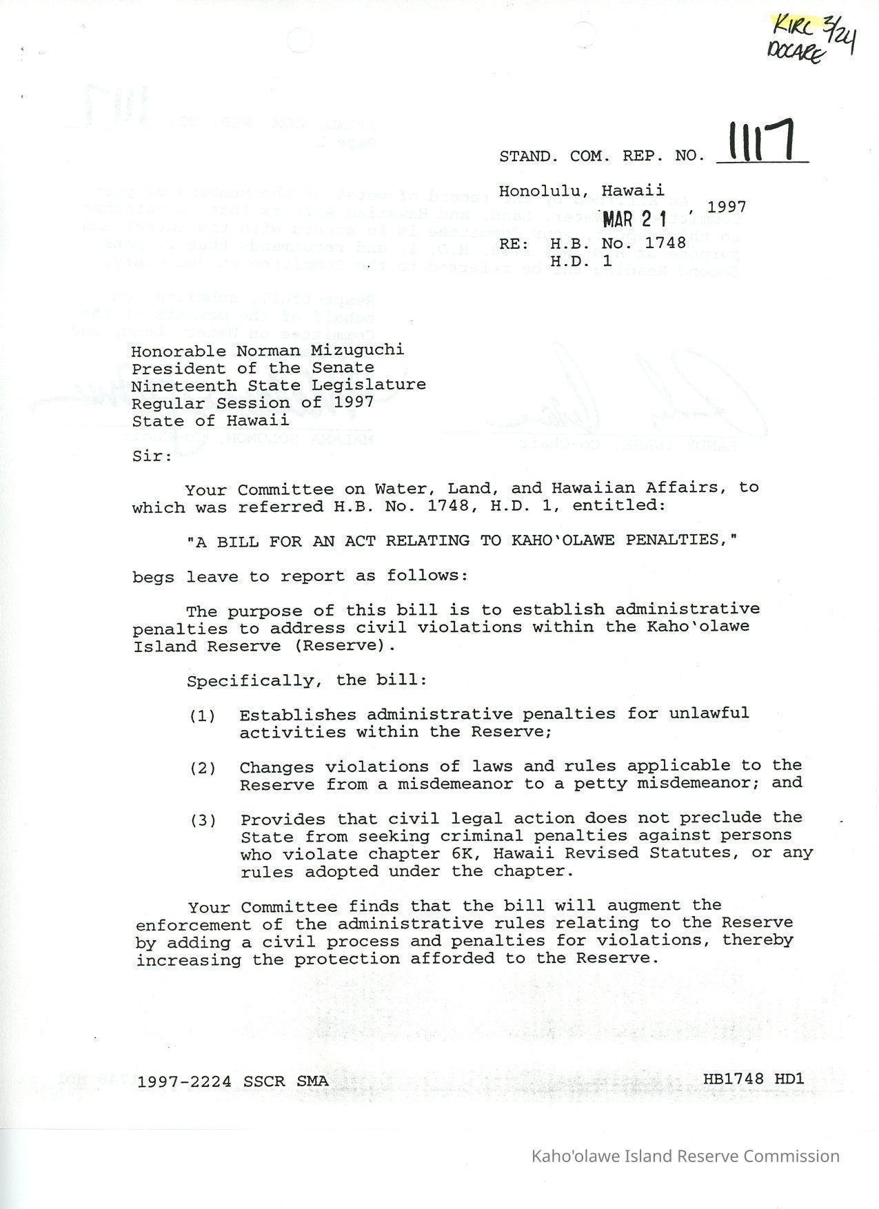 Standing Committee Report No. 1117 re H.B. No. 1748, H.D.1, A Bill for an Act Relating to Kaho'olawe Penalties. Copy received with Record of Votes (KIRC Object ID#2014.015.39).