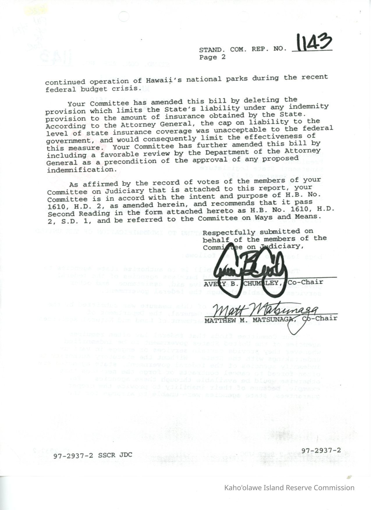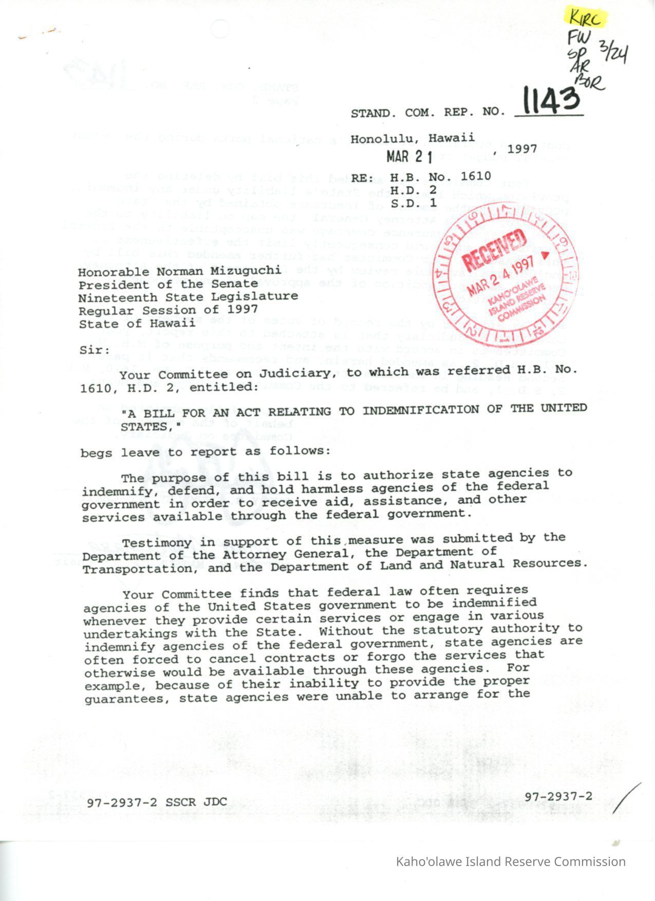 Standing Committee Report No. 1143 re: H.B. No. 1610, H.D. 2 S.D. 1, "A Bill for an Act Relating to Indemnification of the United States." Senate Committee on Judiciary amended bill and recommended measure pass as amended as H.B. No. 1610, H.D. 2, S.D.1 and be referred to the Committee on Ways and Means. Document received by the KIRC on March 24, 1997.