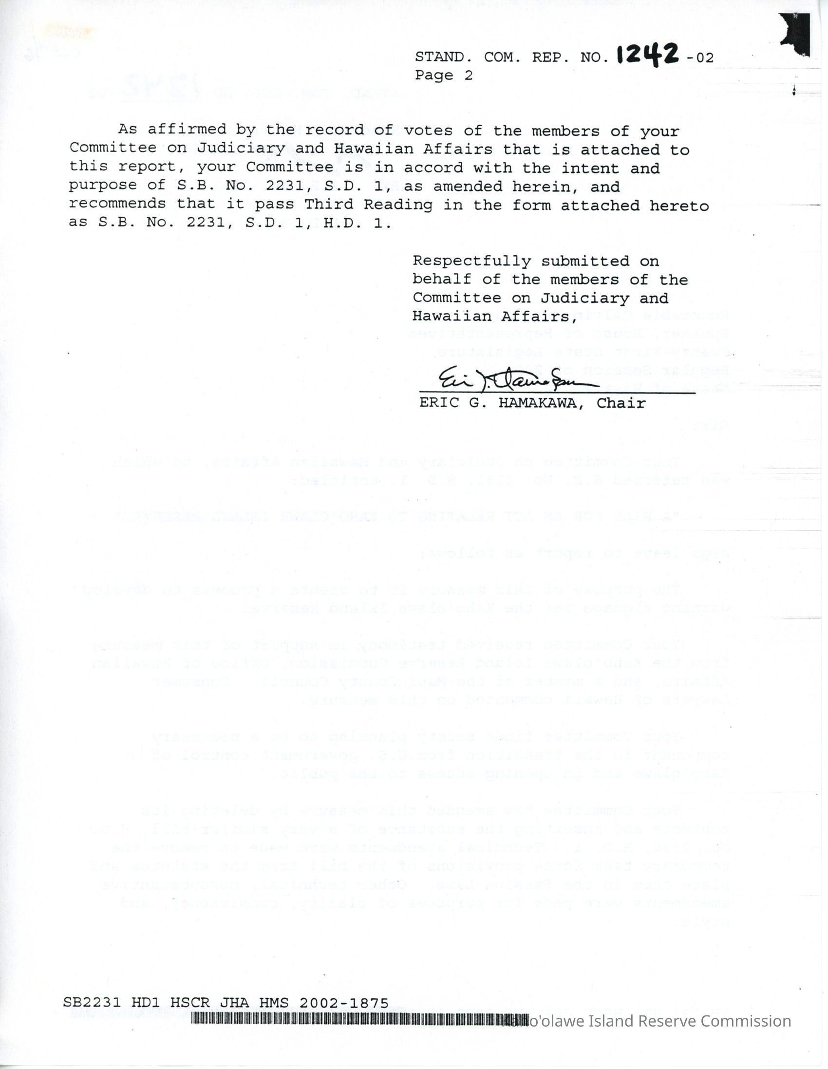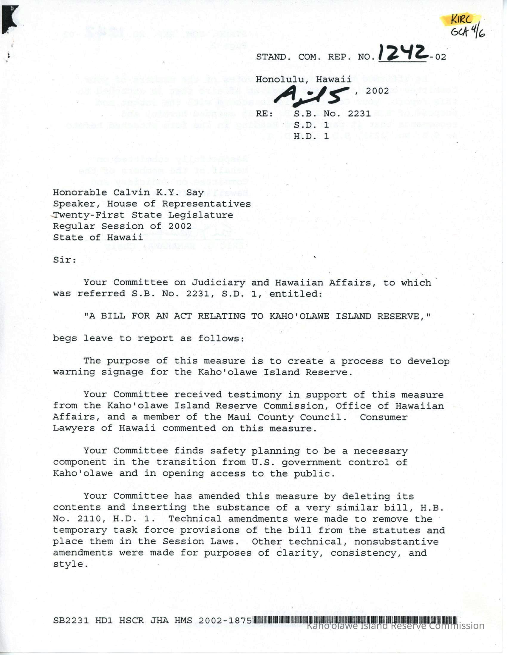 Copy of Standing Committee Report No. 1242-02 re: S.B. No. 2231, S.D. 1, H.D. 1, "A Bill for an Act Relating to Kaho'olawe Island Reserve."Creator