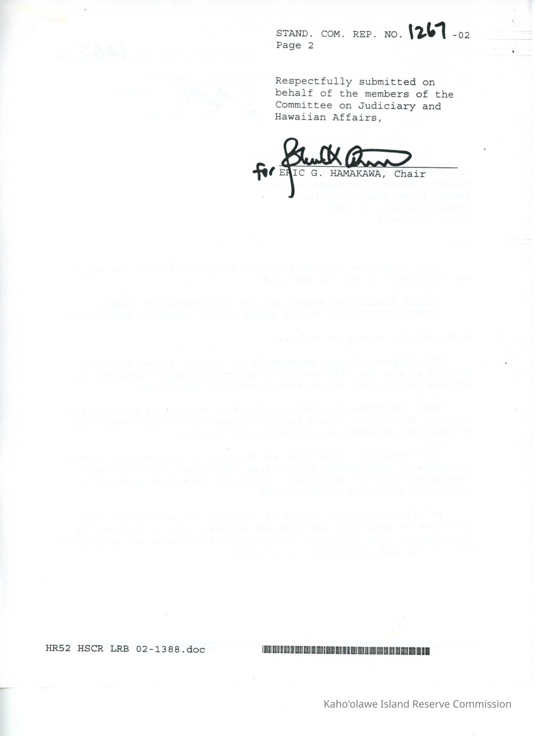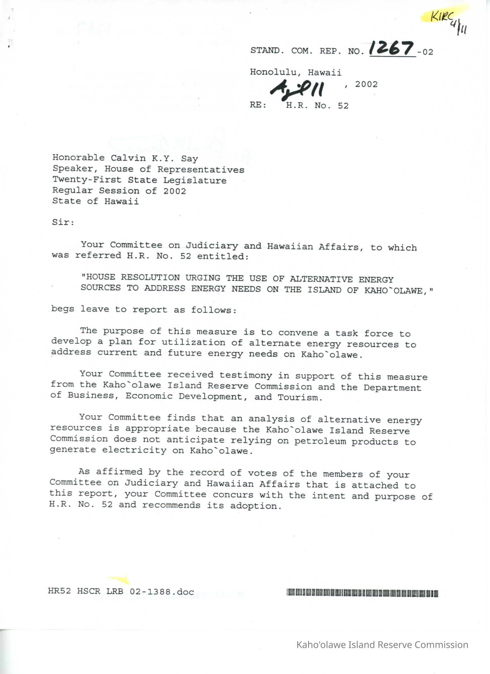 Copy of Standing Committee Report No. 1267-02 re: H.R. No. 52, "House Resolution Urging the Use of Alternative Energy Sources to Address Energy Needs on the Island of Kaho'olawe."Creator