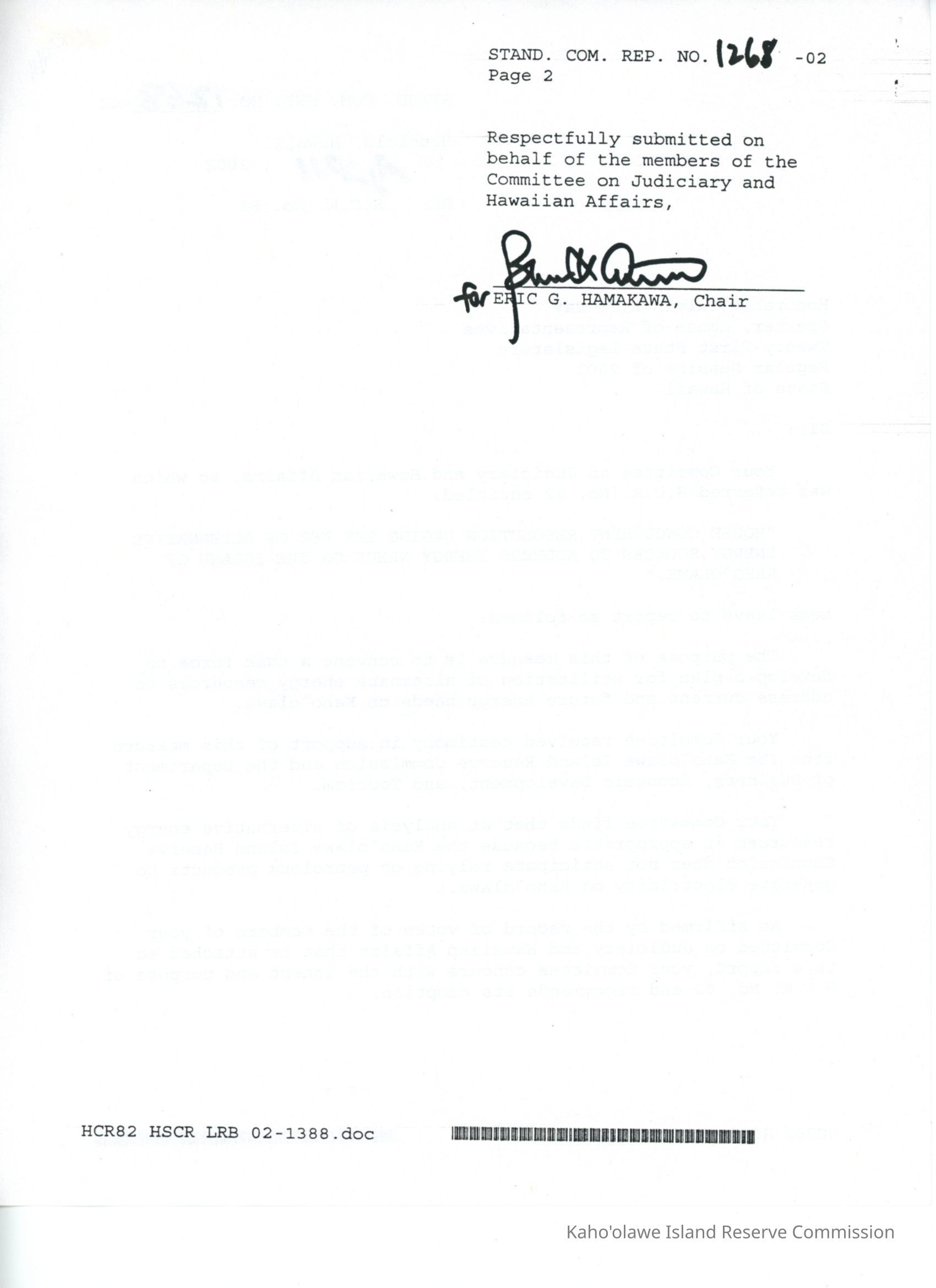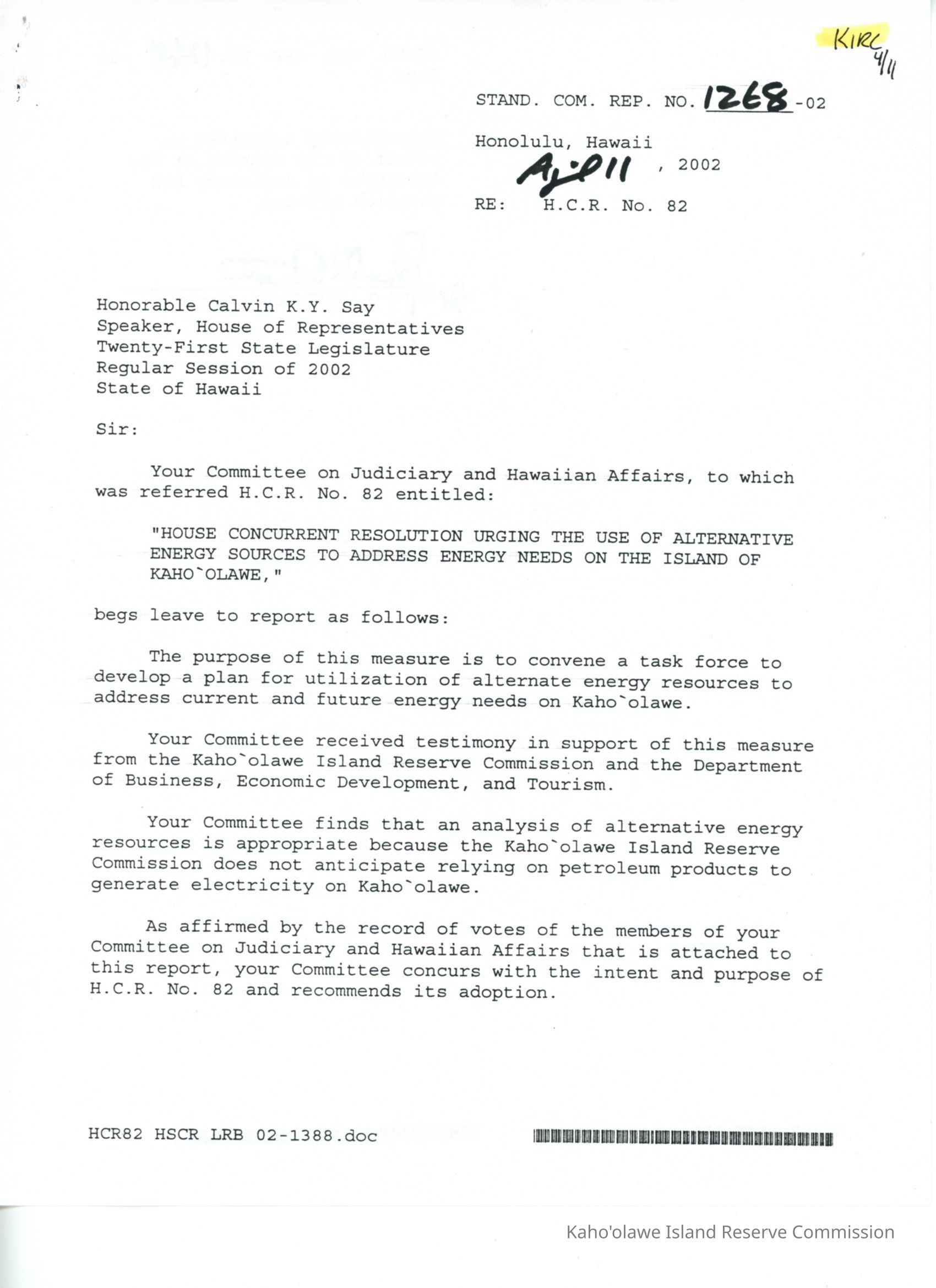 Copy of Standing Committee Report No. 1268-02 re: H.C.R. 82, "House Concurrent Resolution Urging the Use of Alternative Energy Sources to Address Energy Needs on the Island of Kaho'olawe."Creator