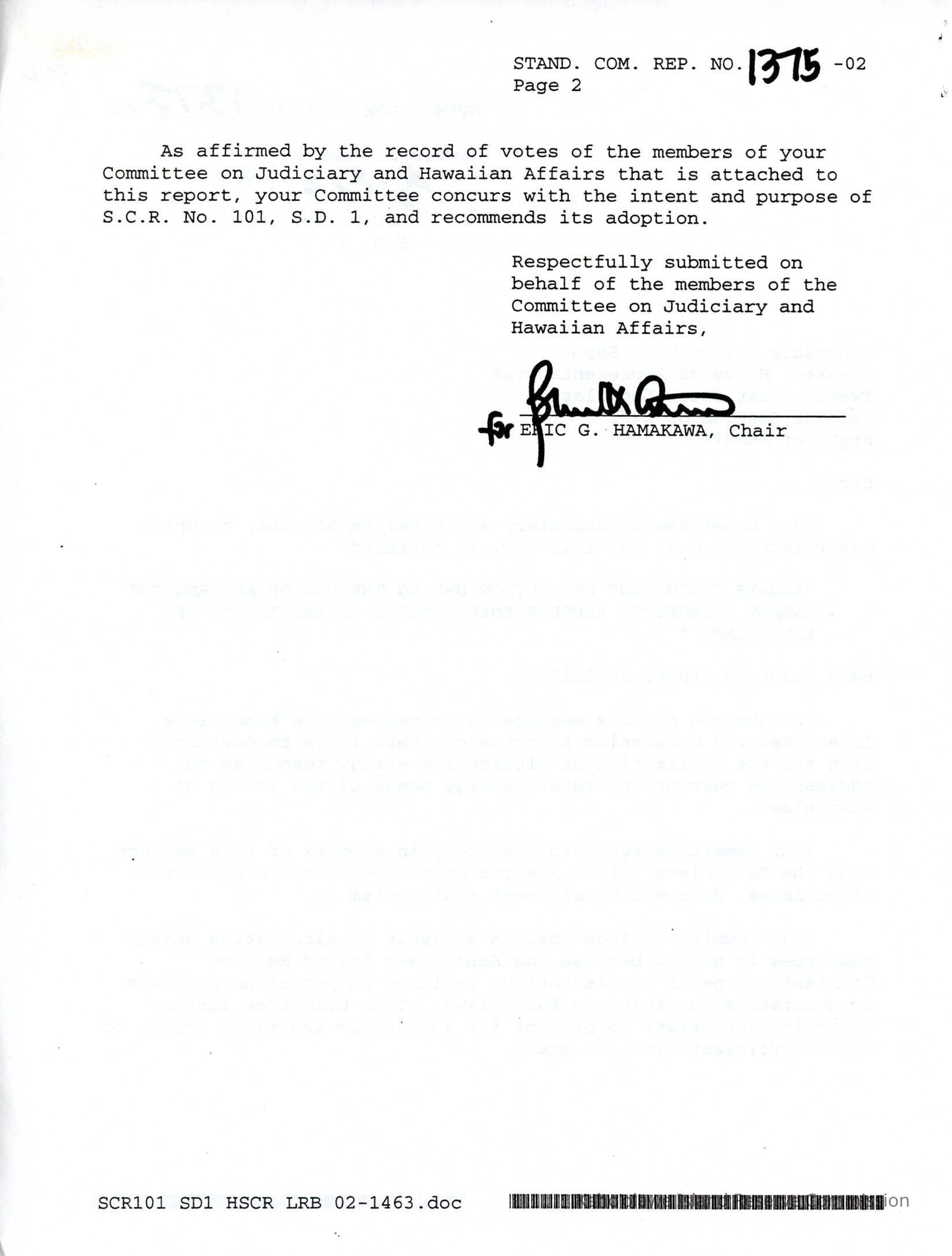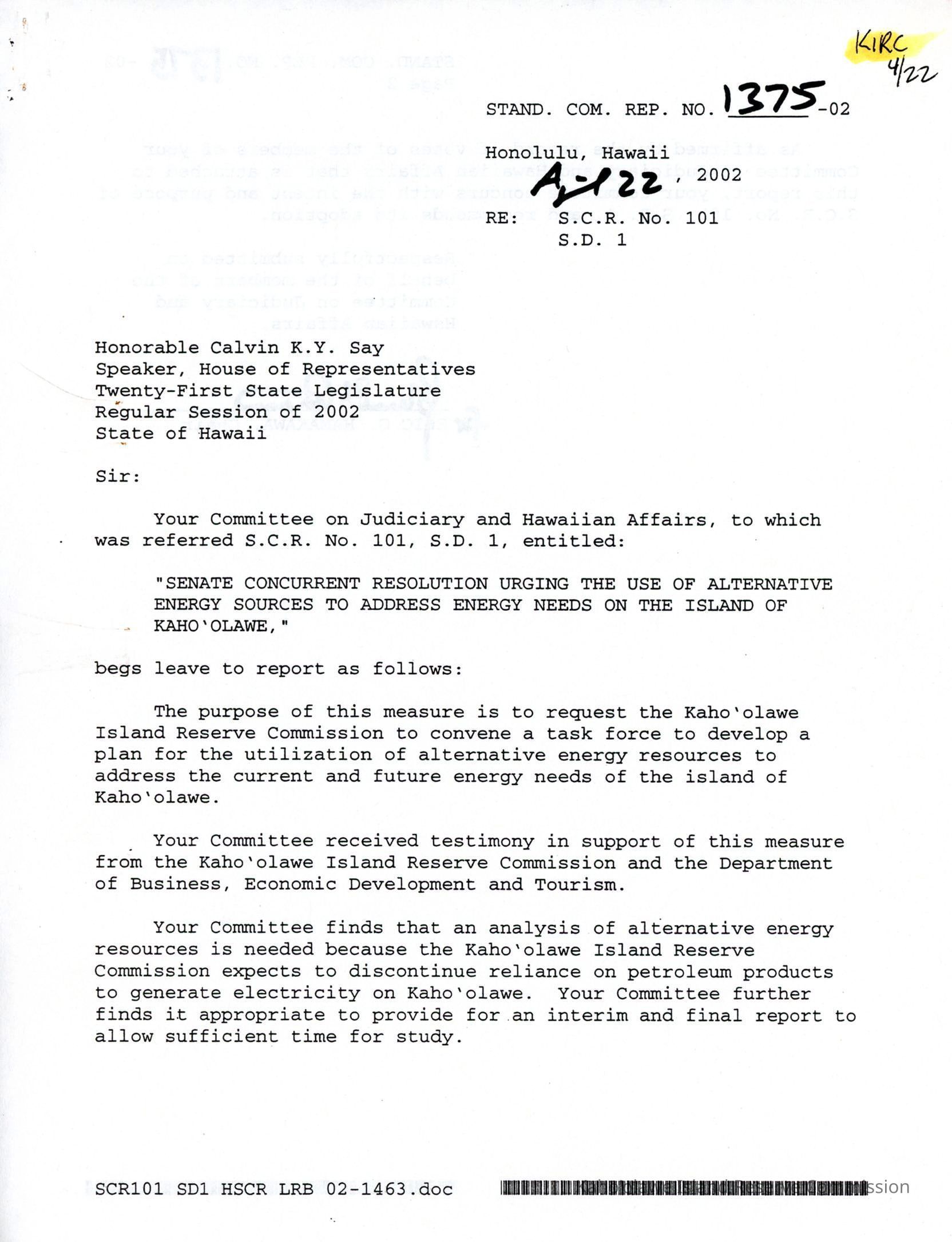 Copy of Standing Committee Report No. 1375-02 re: S.C.R. No. 101 S.D. 1, "Senate Concurrent Resolution Urging the Use of Alternative Energy Sources to Address Energy Needs on the Island of Kaho'olawe."Creator